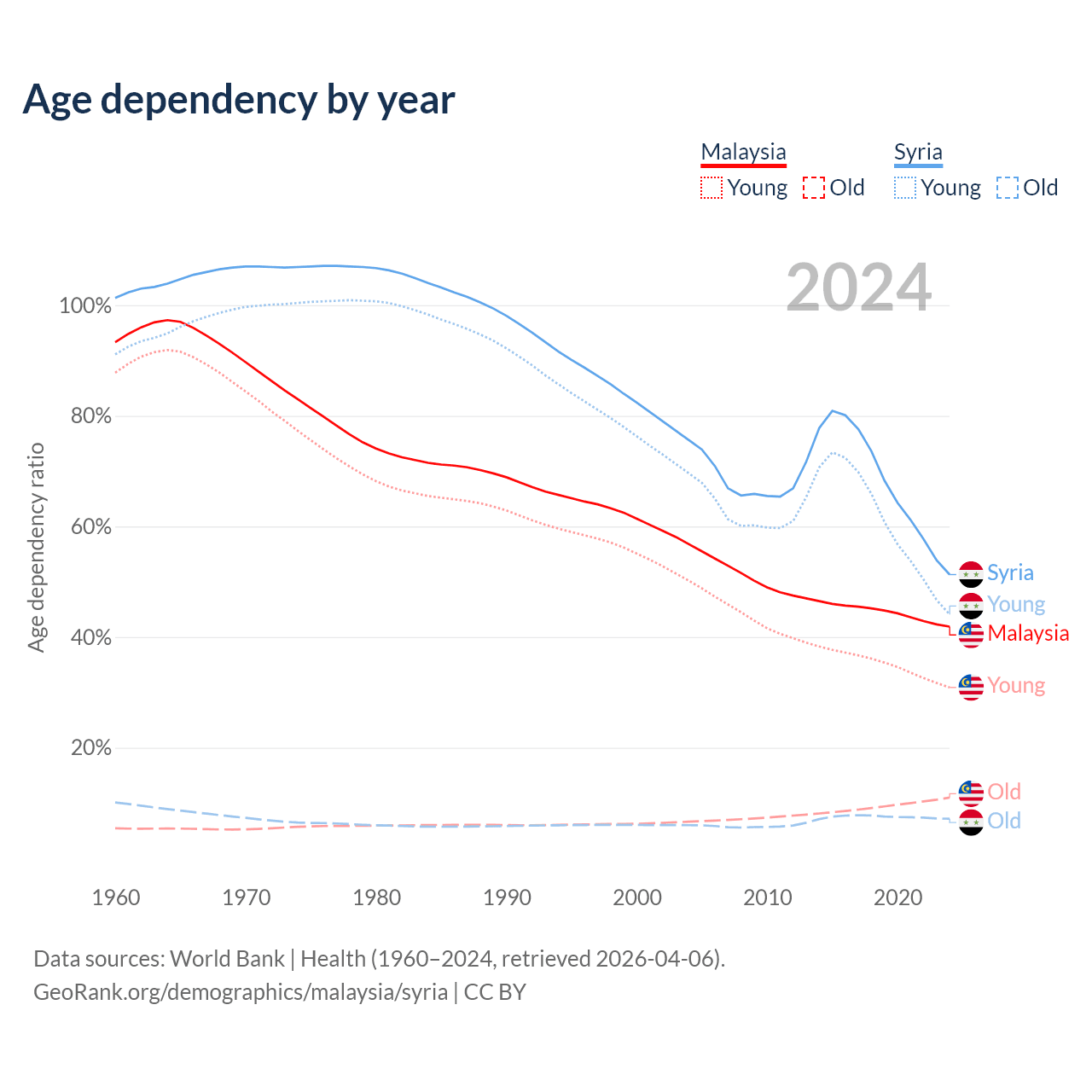 - Malaysia is ranked 92/196 by median age (oldest to youngest) vs 138/196 for Syria.