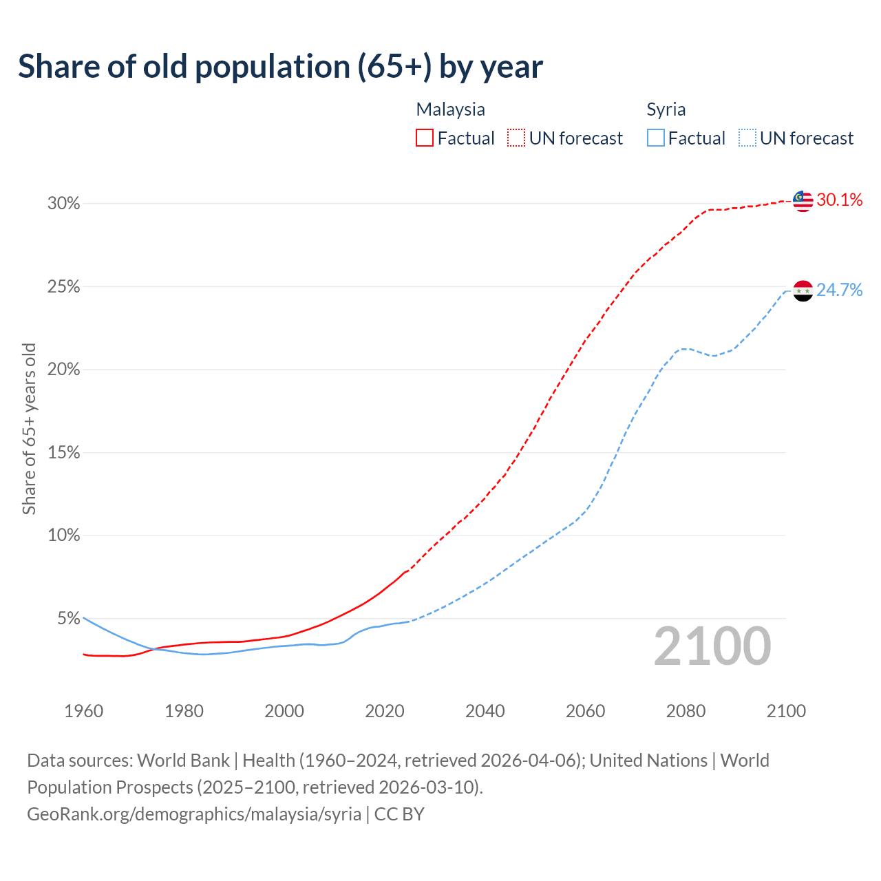 The share of older people aged 65 and over is 7.74% in Malaysia and 4.74% in Syria. Life expectancy in Malaysia compared to Syria .