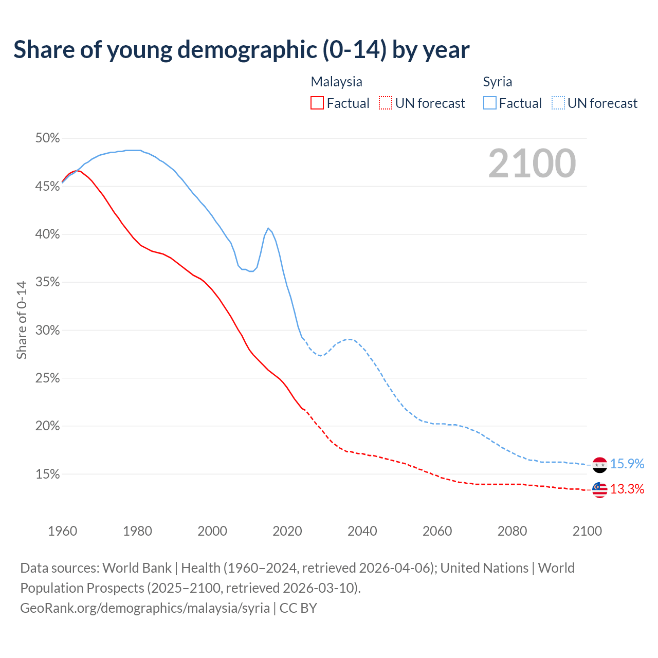 - The share of young demographic (0-15 years old) in Malaysia is 21.8% vs 29.2% in Syria.