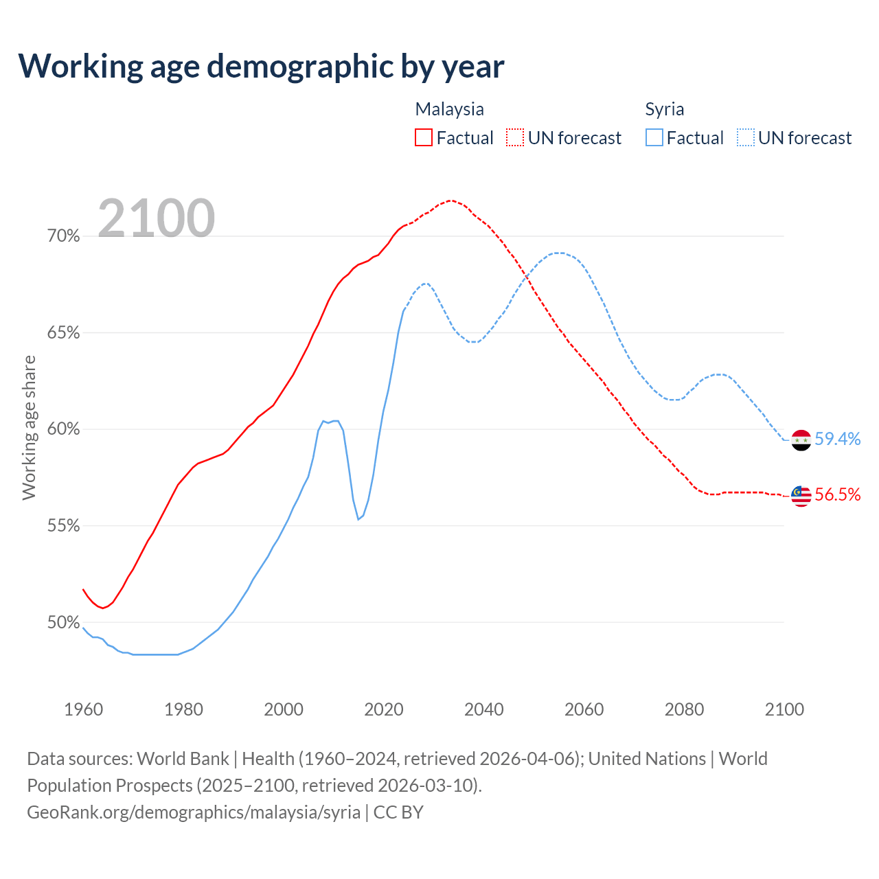 - Malaysia has 25.7M working age adults (aged 15-64) vs 17.7M in Syria.
