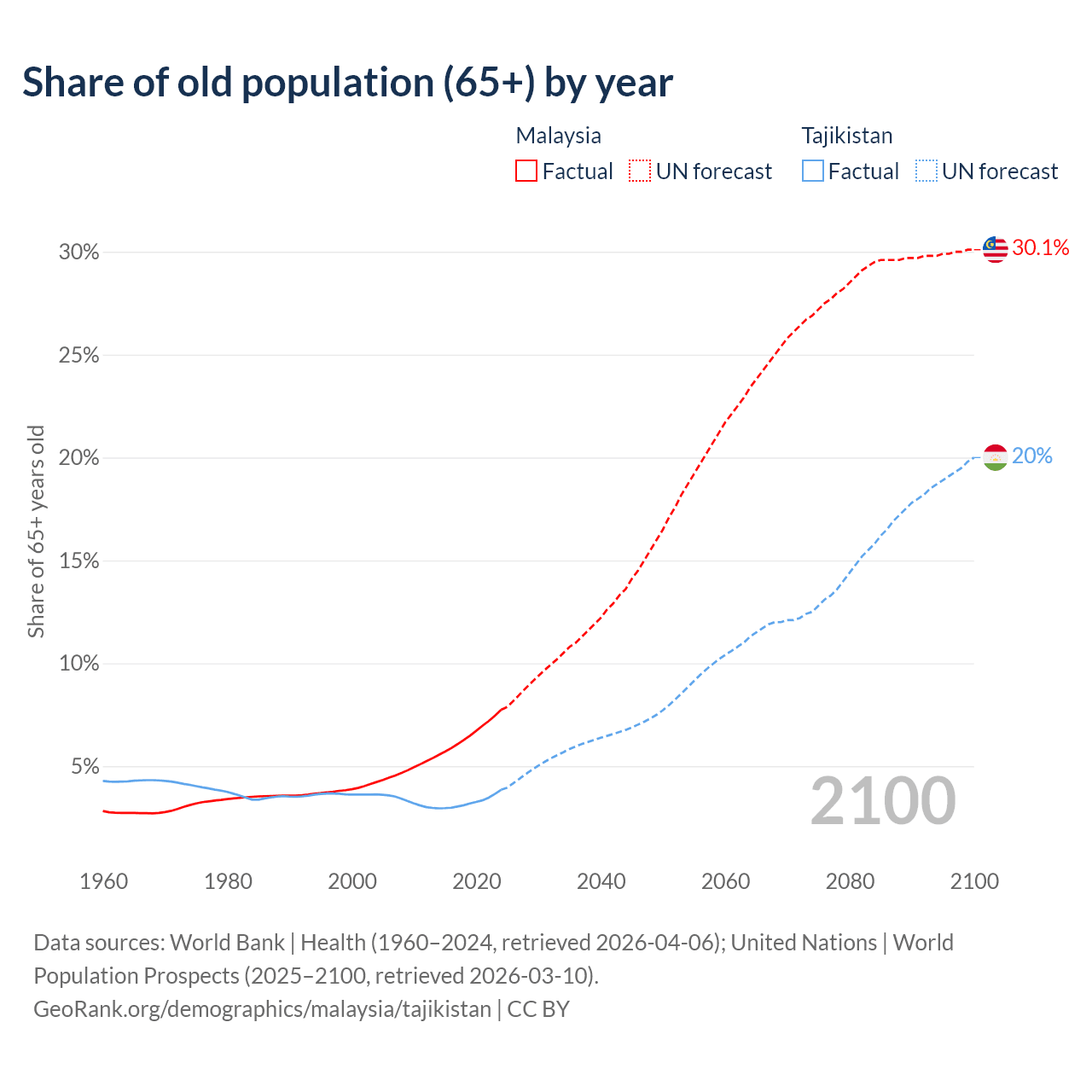 The share of older people aged 65 and over is 7.74% in Malaysia and 3.85% in Tajikistan. Life expectancy in Malaysia compared to Tajikistan .