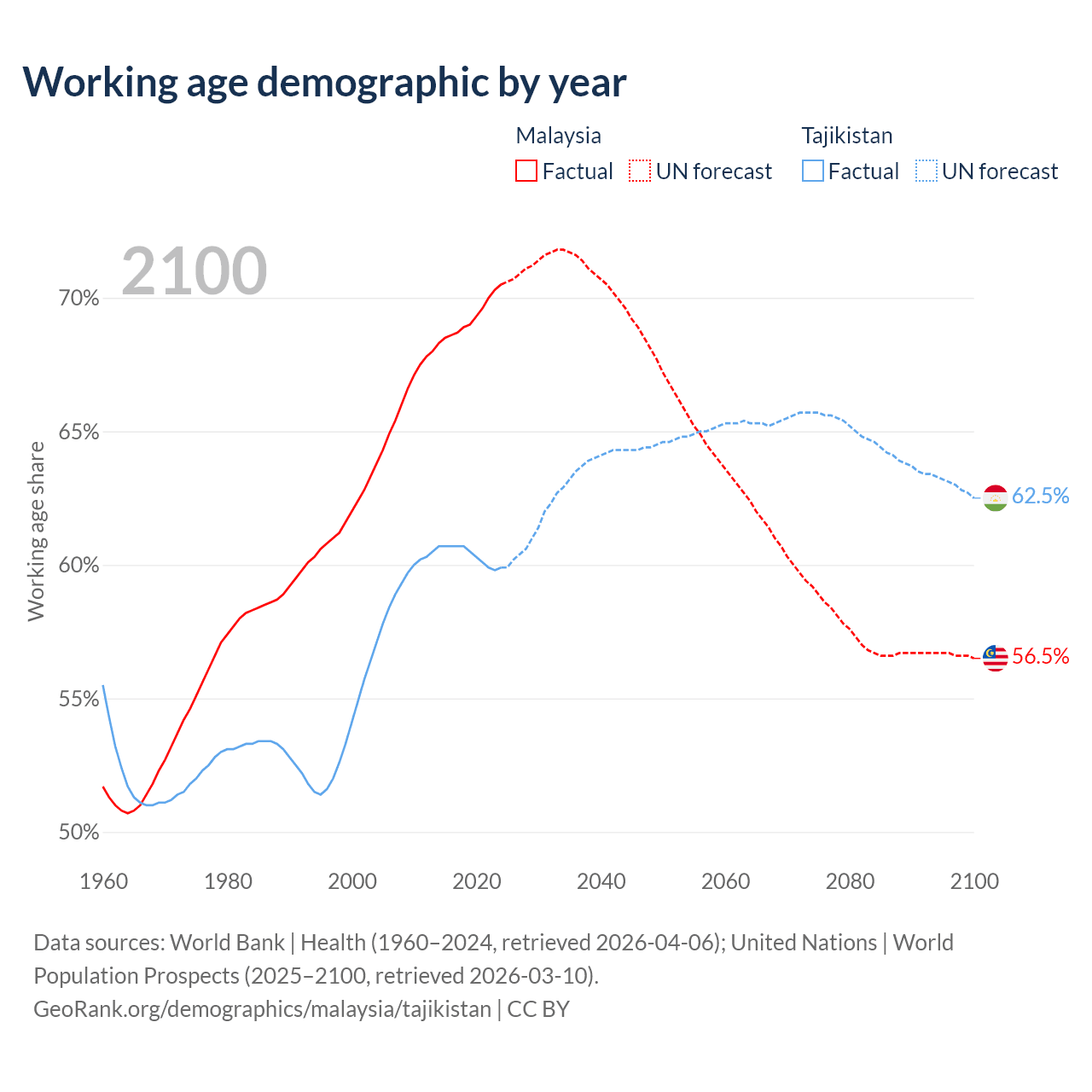 Median age Malaysia vs Tajikistan, 1960-2100