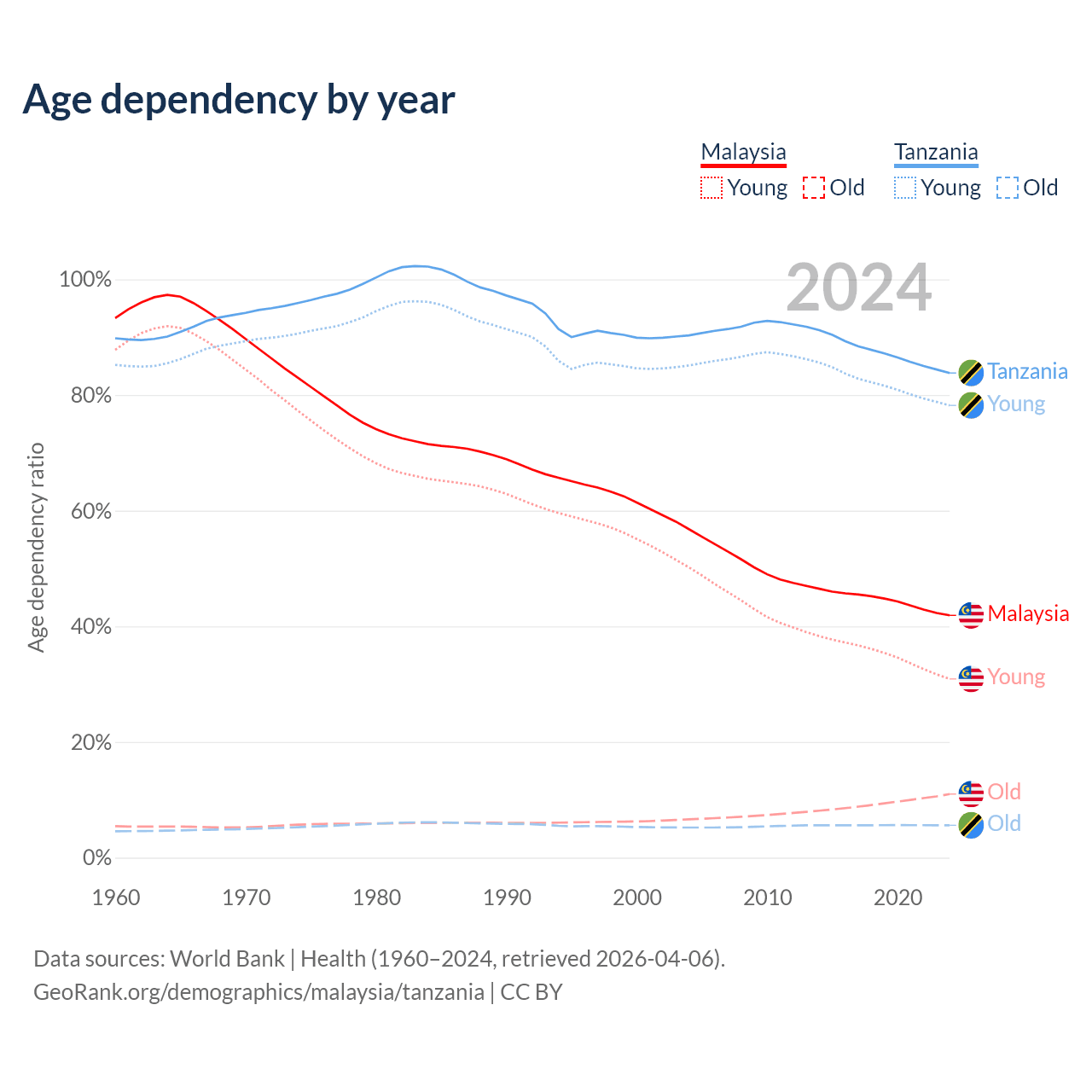 - Malaysia is ranked 92/196 by median age (oldest to youngest) vs 184/196 for Tanzania.