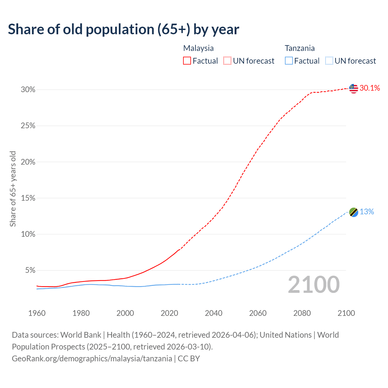 The share of older people aged 65 and over is 7.74% in Malaysia and 3.05% in Tanzania. Life expectancy in Malaysia compared to Tanzania .