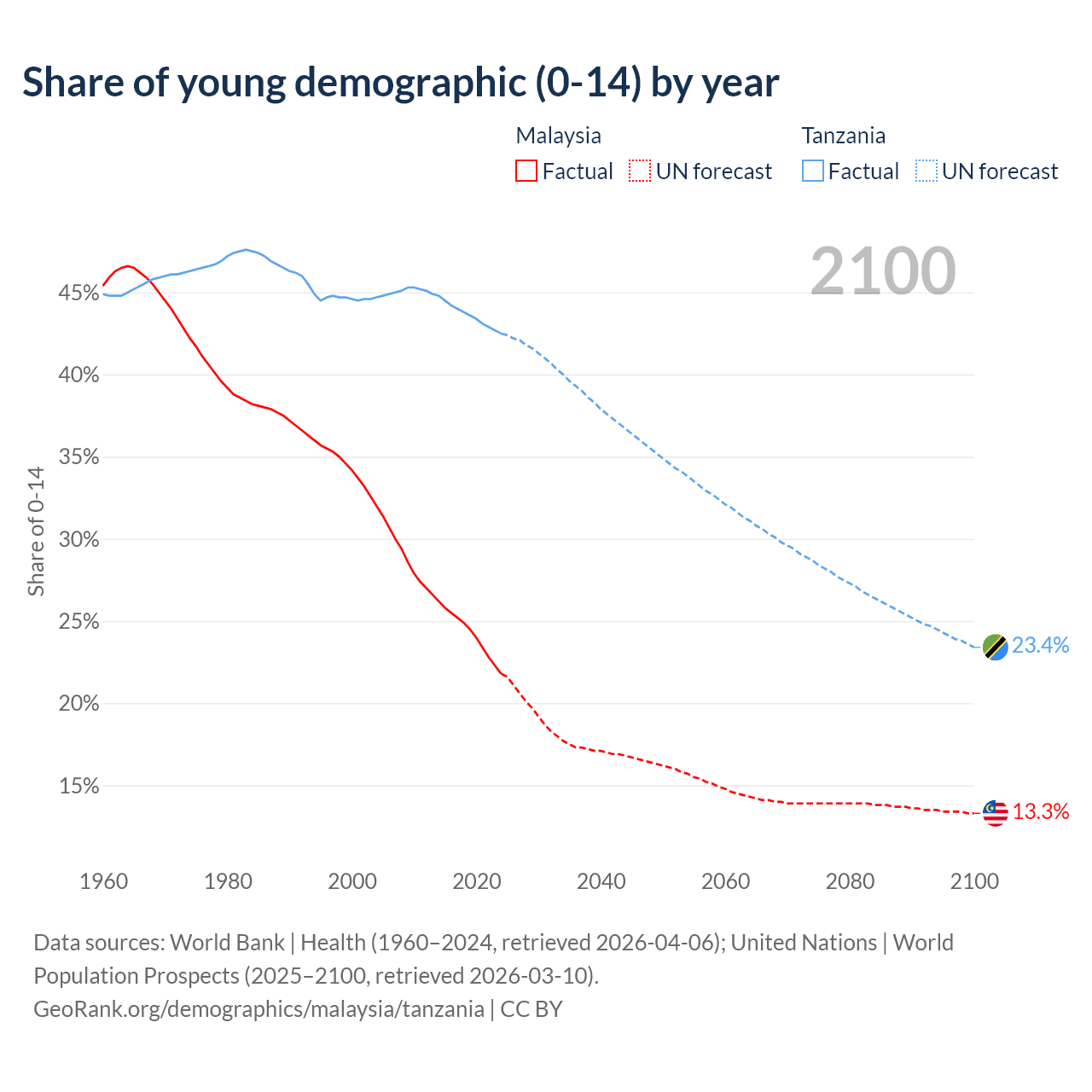 - As of 2026, the population of Malaysia is 36.5M vs 73.1M in Tanzania - 2 times difference.