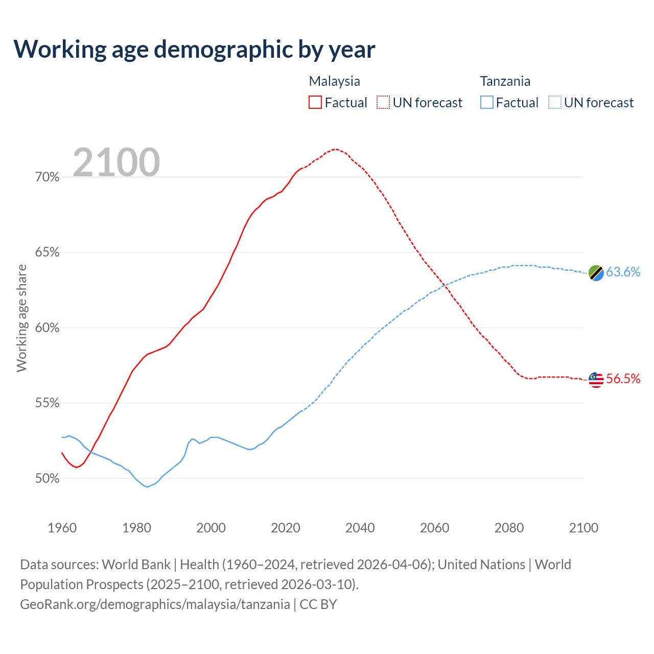 - Malaysia has 25.7M working age adults (aged 15-64) vs 39.8M in Tanzania.
