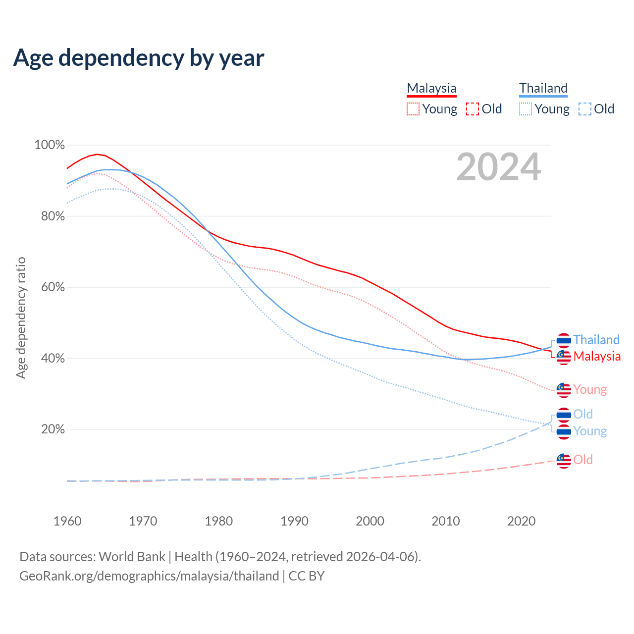 The share of older people aged 65 and over is 7.74% in Malaysia and 15.4% in Thailand. Life expectancy in Malaysia compared to Thailand .