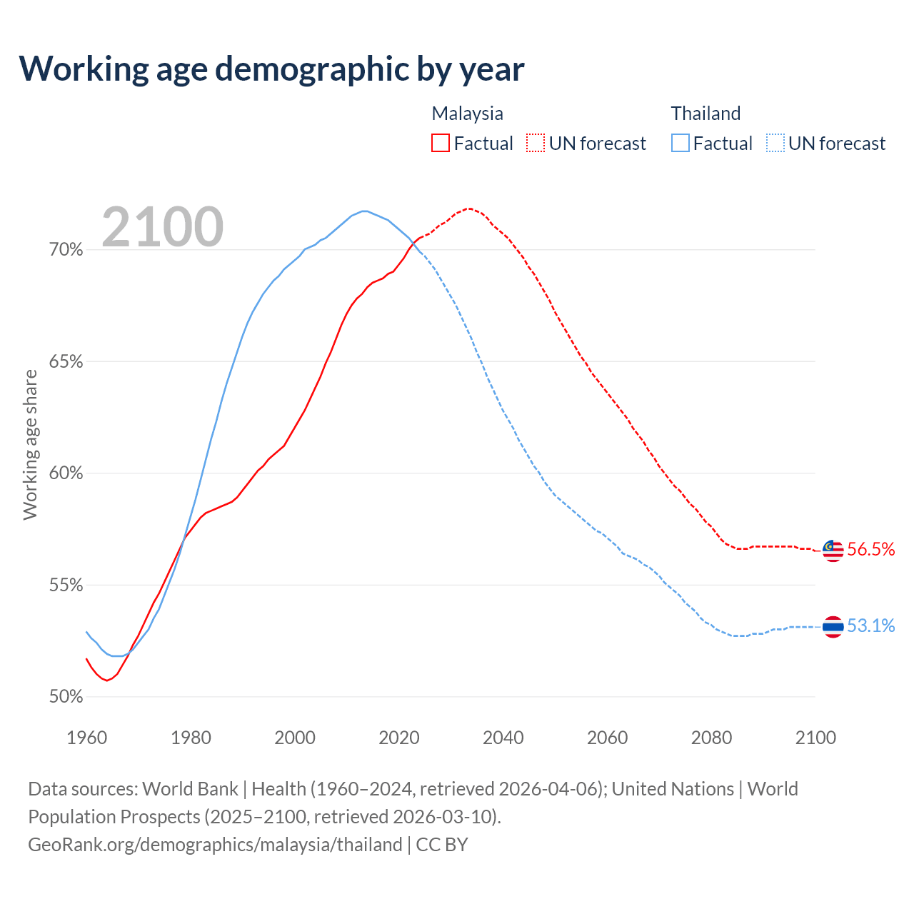 - Malaysia has 25.7M working age adults (aged 15-64) vs 50M in Thailand.