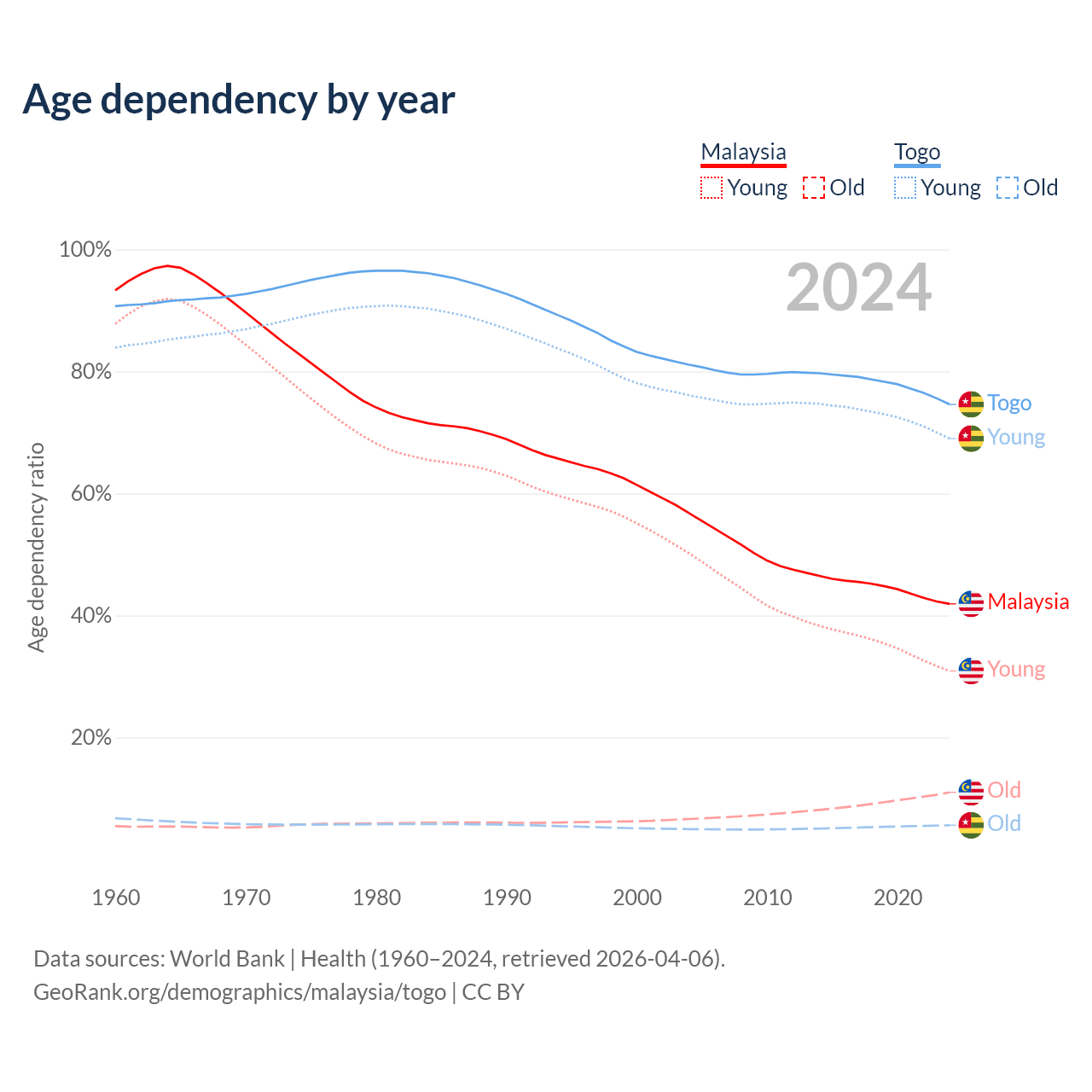 - Malaysia is ranked 92/196 by median age (oldest to youngest) vs 166/196 for Togo.