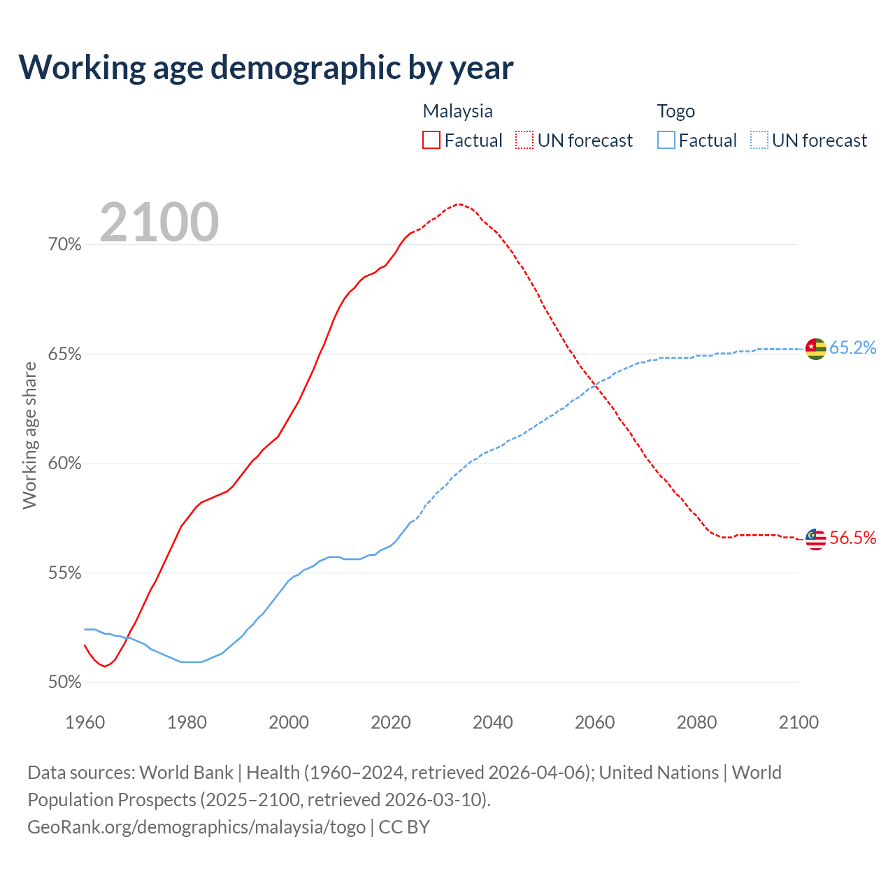 - Malaysia has 25.7M working age adults (aged 15-64) vs 5.72M in Togo.