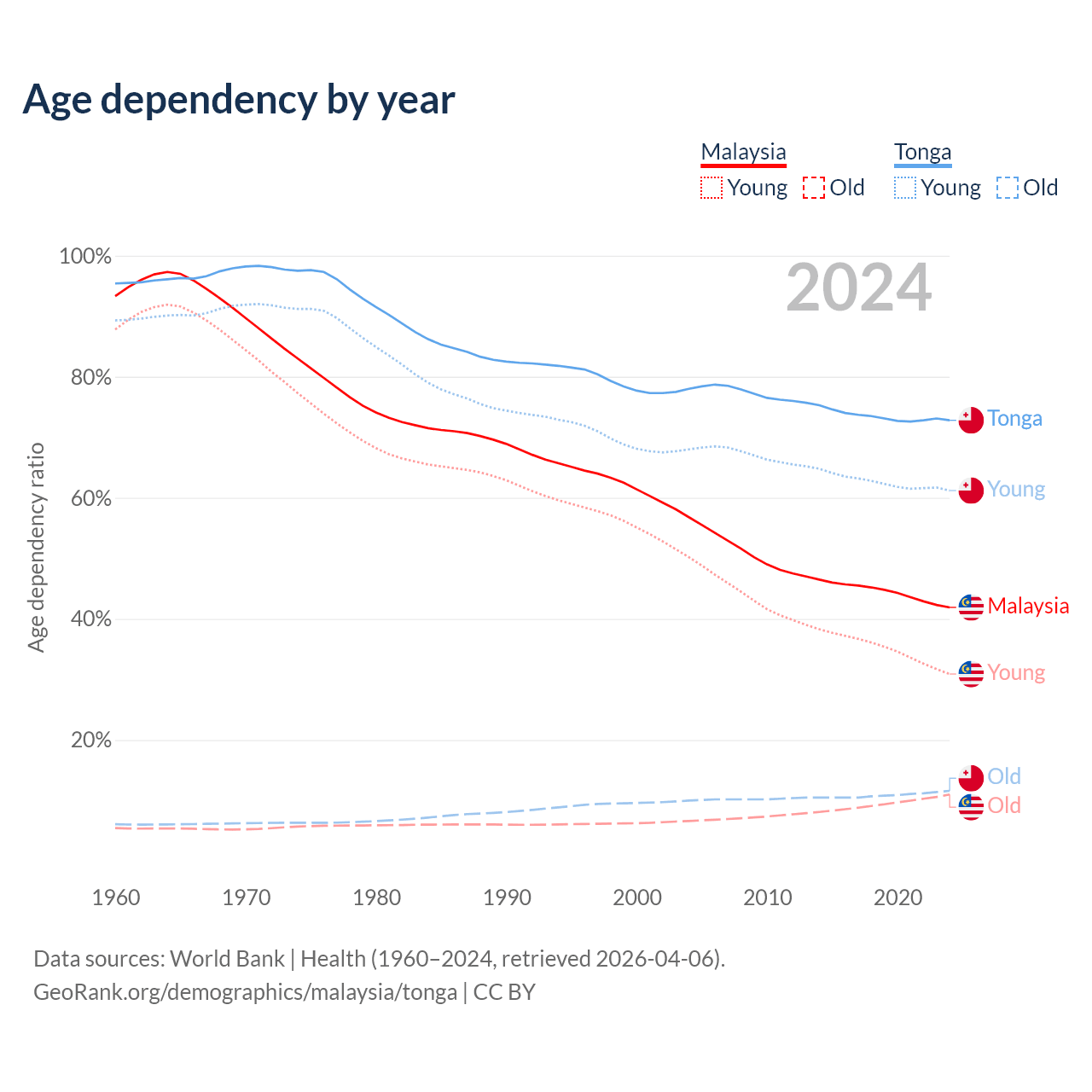 Data sources: World Bank | Health (1960–2024, retrieved 2026-04-06); U.S. Census Bureau (1960–2024, retrieved 2026-02-08).