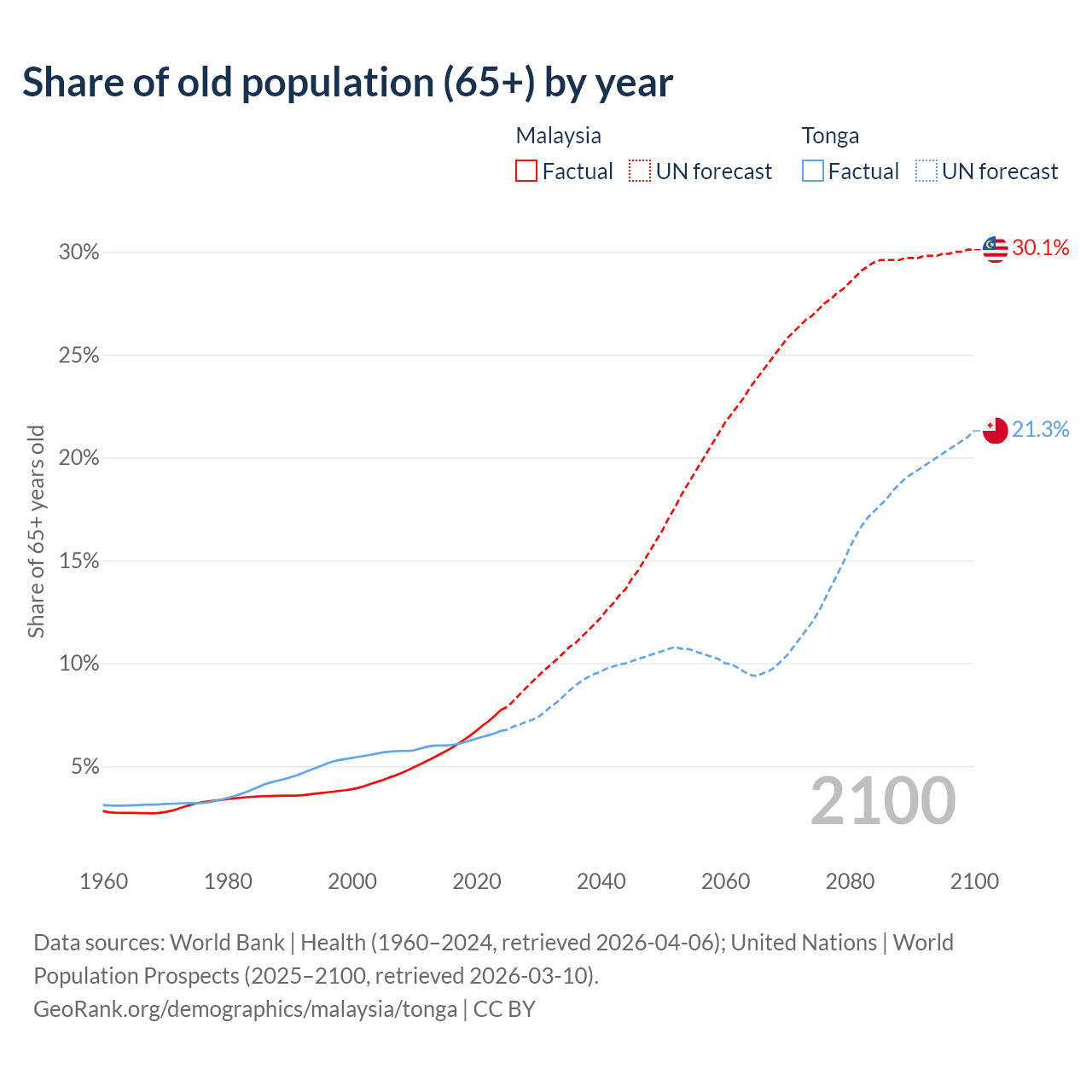 The share of older people aged 65 and over is 7.74% in Malaysia and 6.72% in Tonga. Life expectancy in Malaysia compared to Tonga .