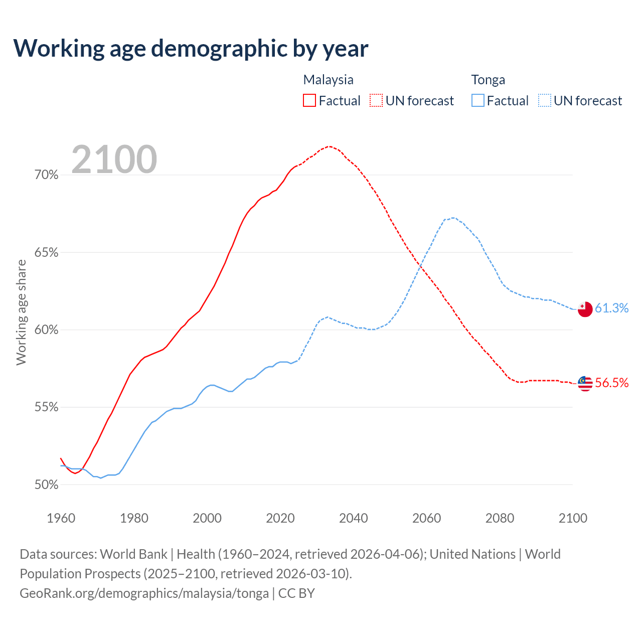- Malaysia has 25.7M working age adults (aged 15-64) vs 59.8K in Tonga.