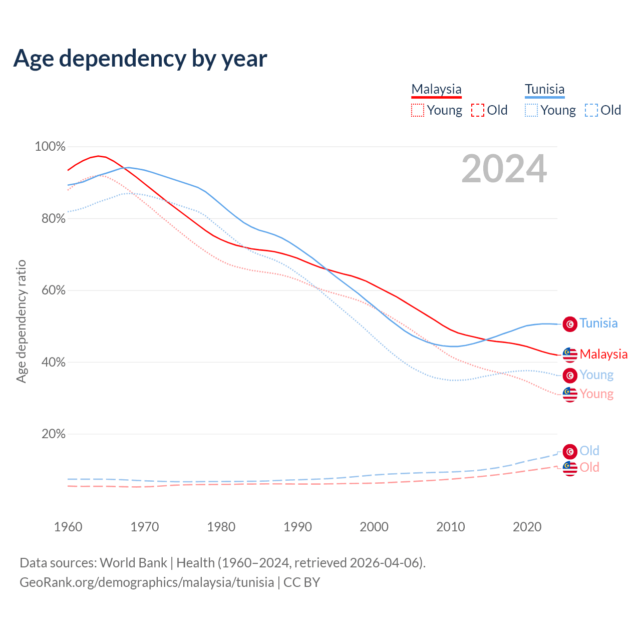 - Malaysia is ranked 92/196 by median age (oldest to youngest) vs 86/196 for Tunisia.