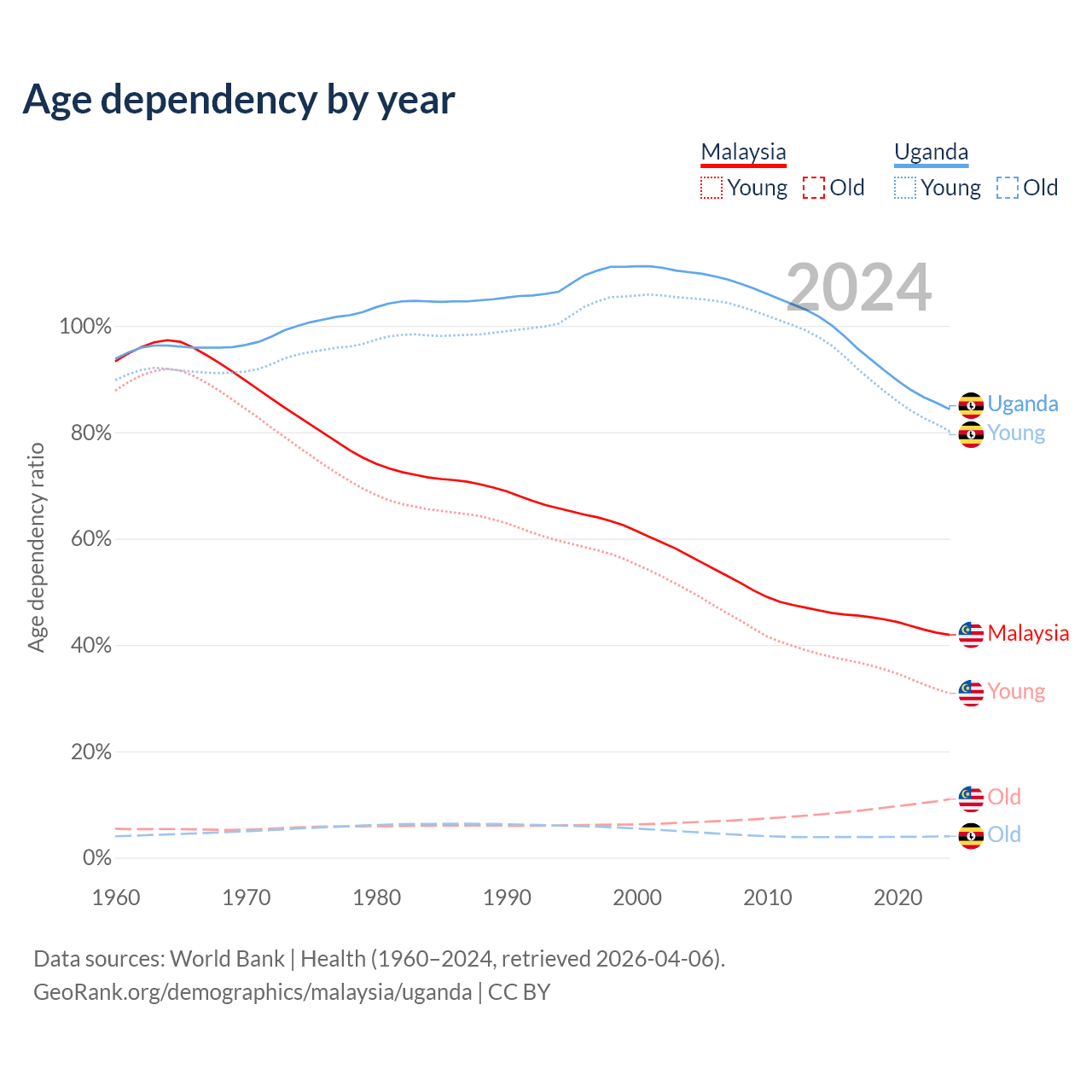 - Malaysia is ranked 92/196 by median age (oldest to youngest) vs 187/196 for Uganda.