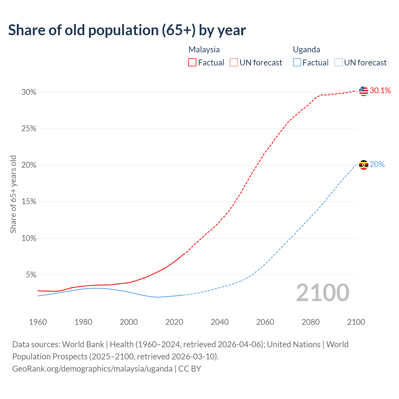 The share of older people aged 65 and over is 7.74% in Malaysia and 2.19% in Uganda. Life expectancy in Malaysia compared to Uganda .
