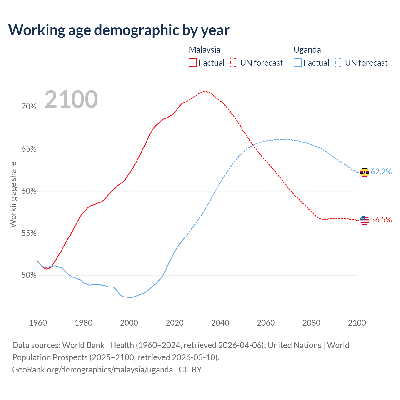 - Malaysia has 25.7M working age adults (aged 15-64) vs 28.9M in Uganda.