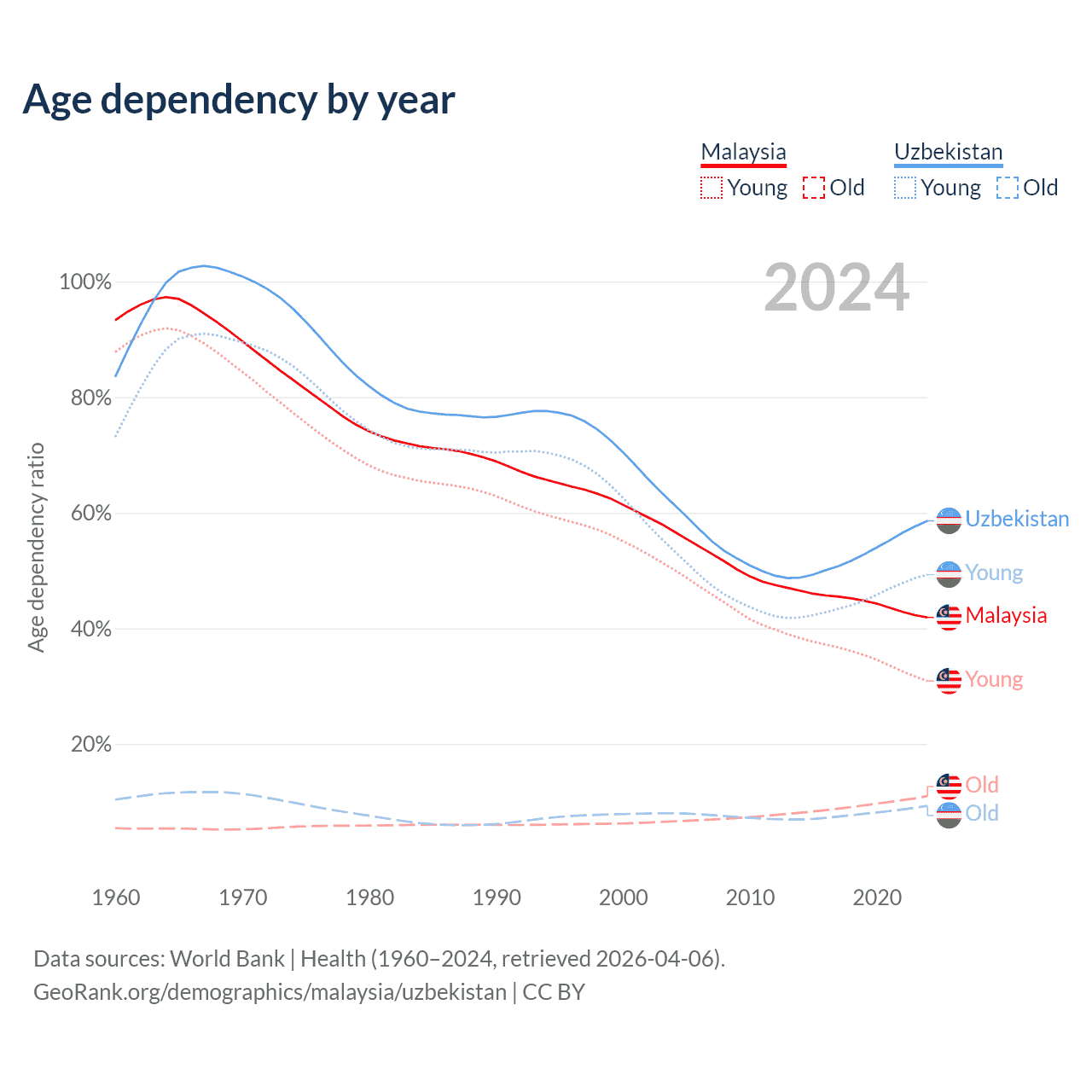 - Malaysia is ranked 92/196 by median age (oldest to youngest) vs 116/196 for Uzbekistan.