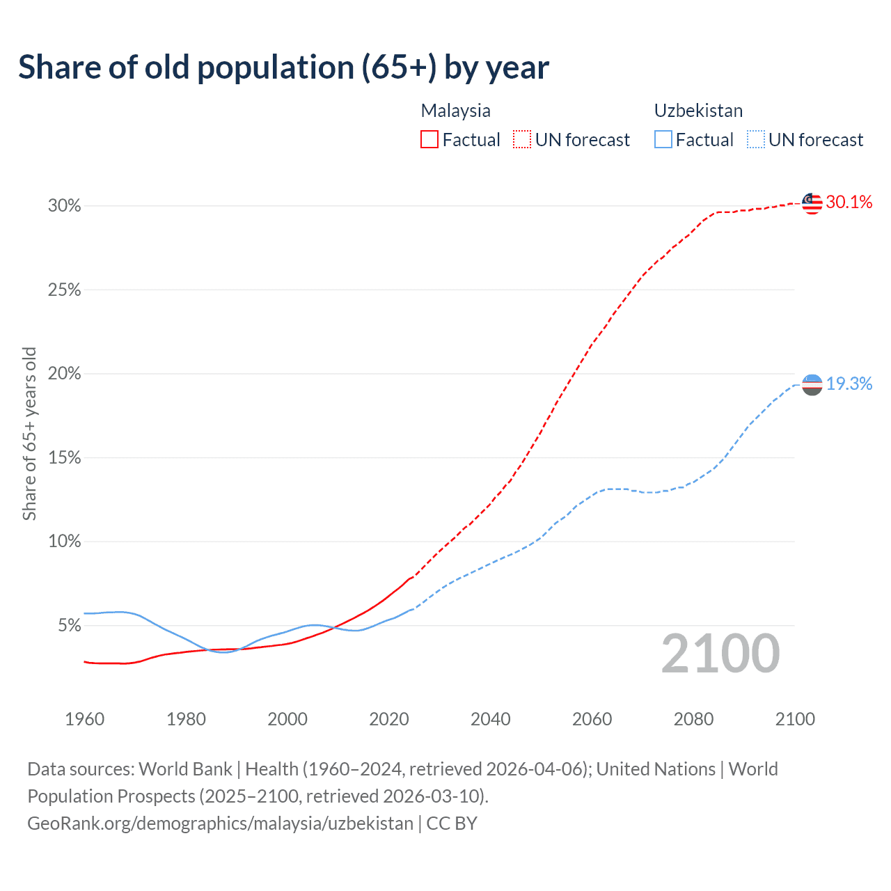 The share of older people aged 65 and over is 7.74% in Malaysia and 5.86% in Uzbekistan. Life expectancy in Malaysia compared to Uzbekistan .