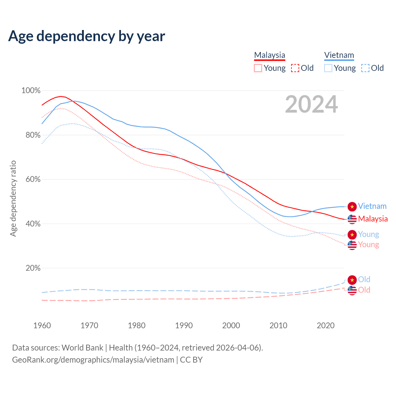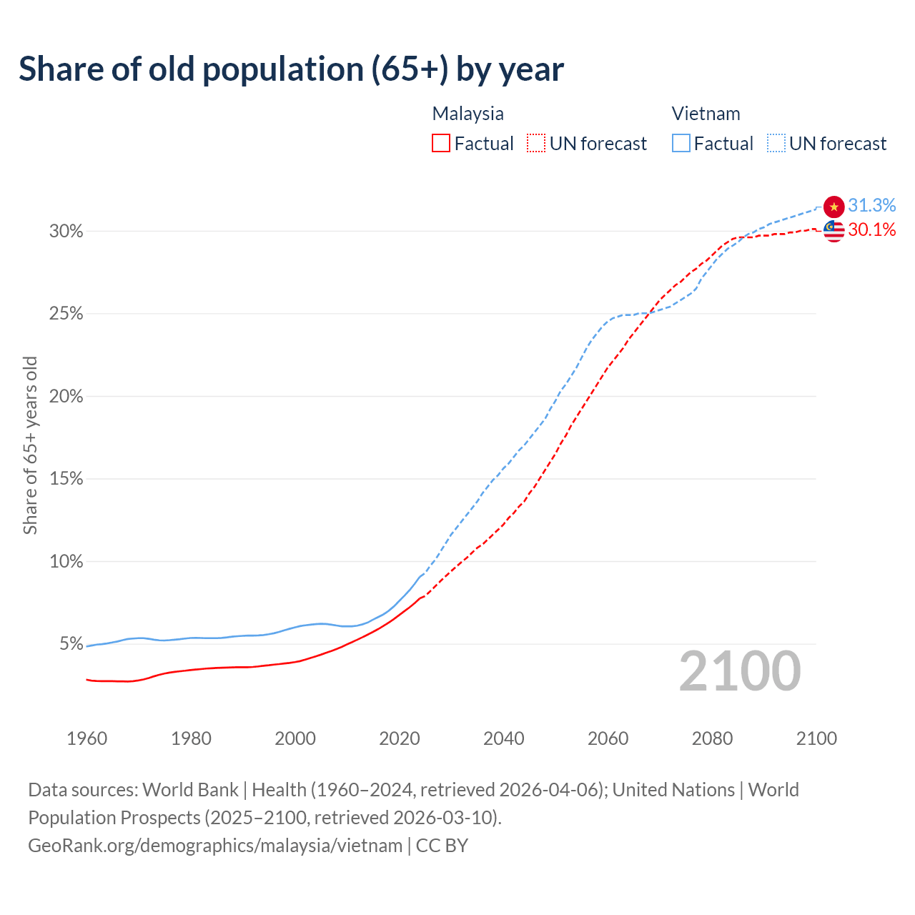 The share of older people aged 65 and over is 7.74% in Malaysia and 9.05% in Vietnam. Life expectancy in Malaysia compared to Vietnam .