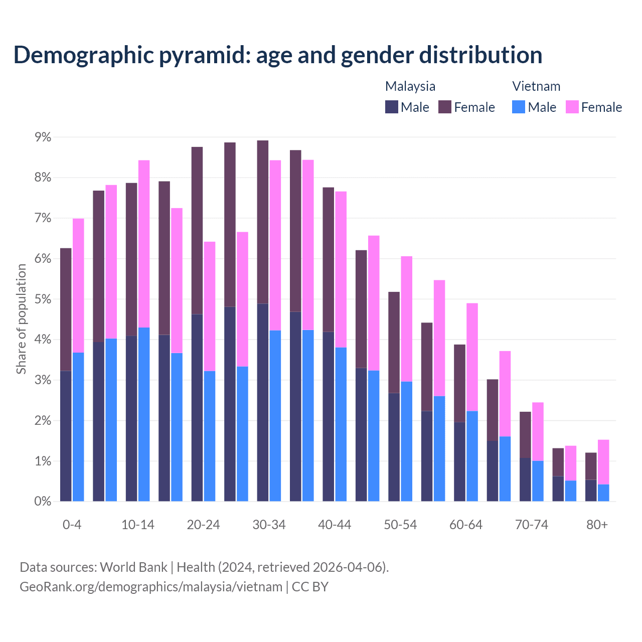 - Malaysia is ranked 92/196 by median age (oldest to youngest) vs 84/196 for Vietnam.