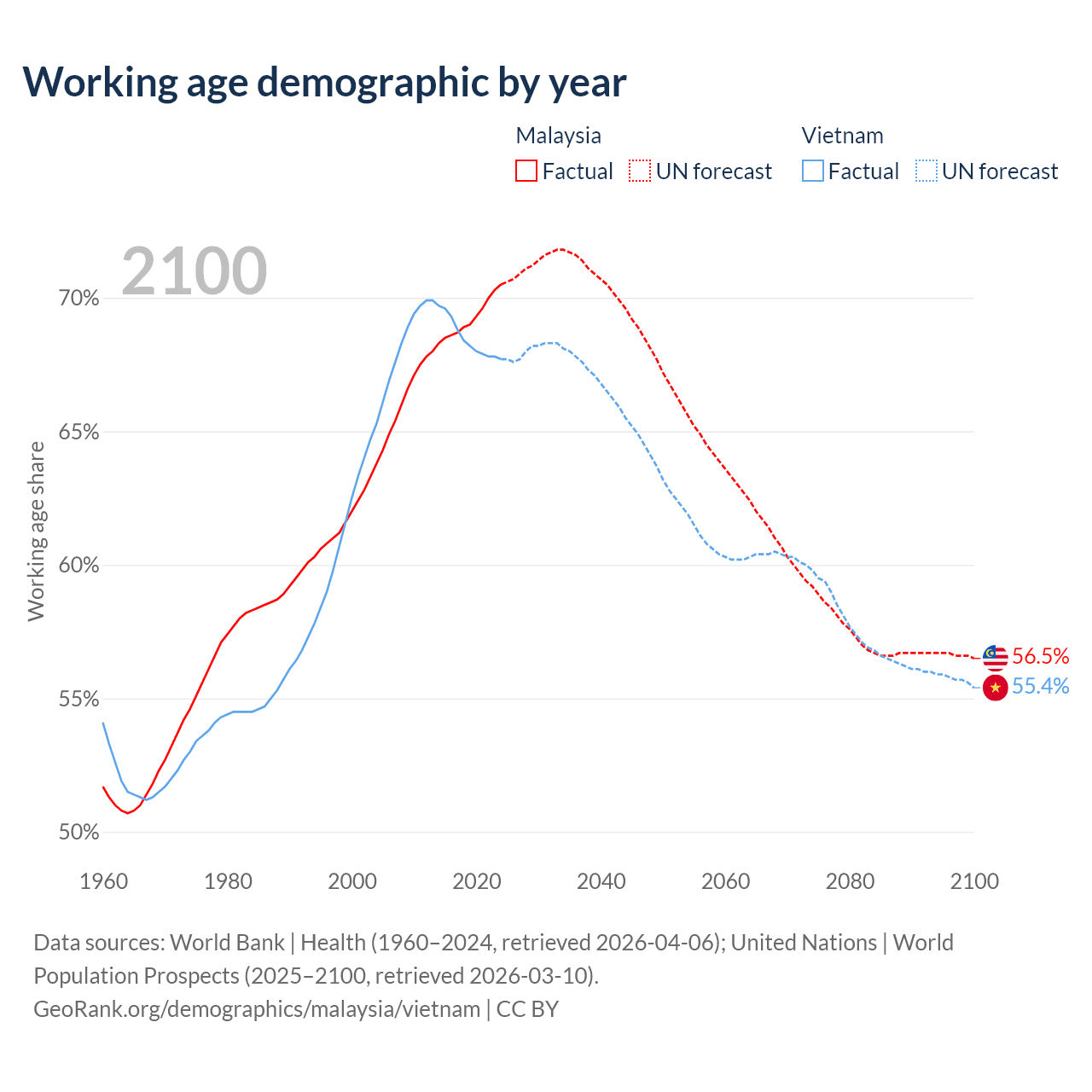 - Malaysia has 25.7M working age adults (aged 15-64) vs 69.3M in Vietnam.