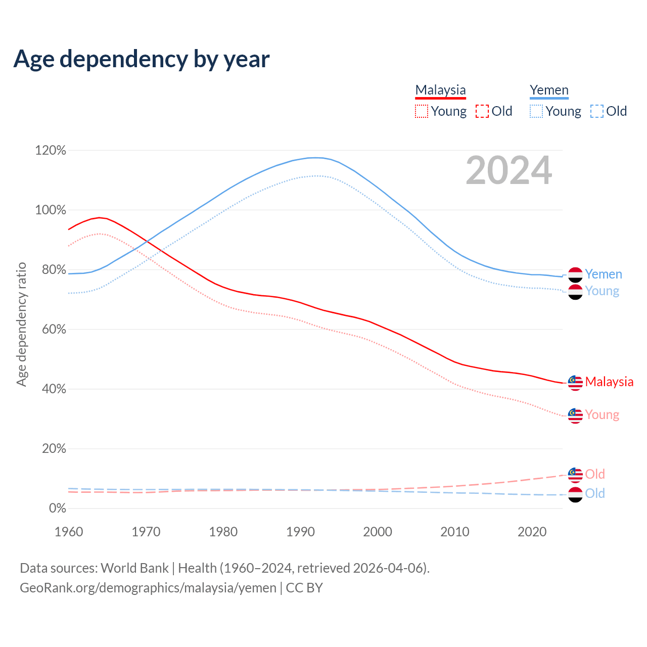 The share of older people aged 65 and over is 7.74% in Malaysia and 2.52% in Yemen. Life expectancy in Malaysia compared to Yemen .