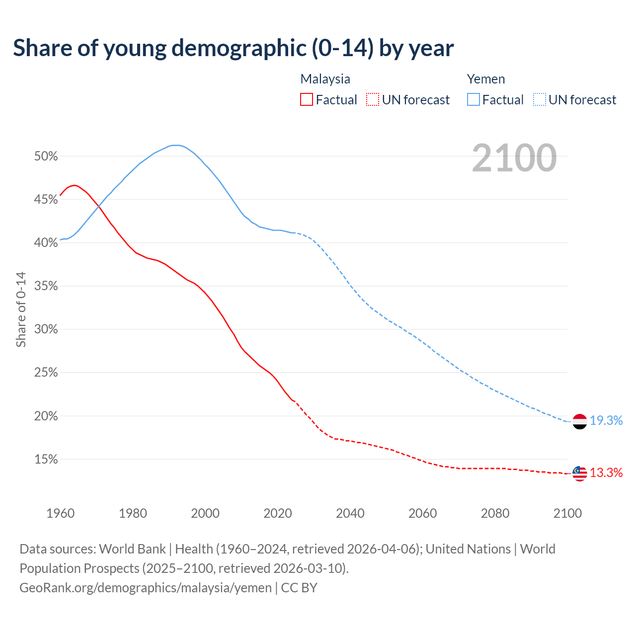 - The share of young demographic (0-15 years old) in Malaysia is 21.8% vs 41.1% in Yemen.