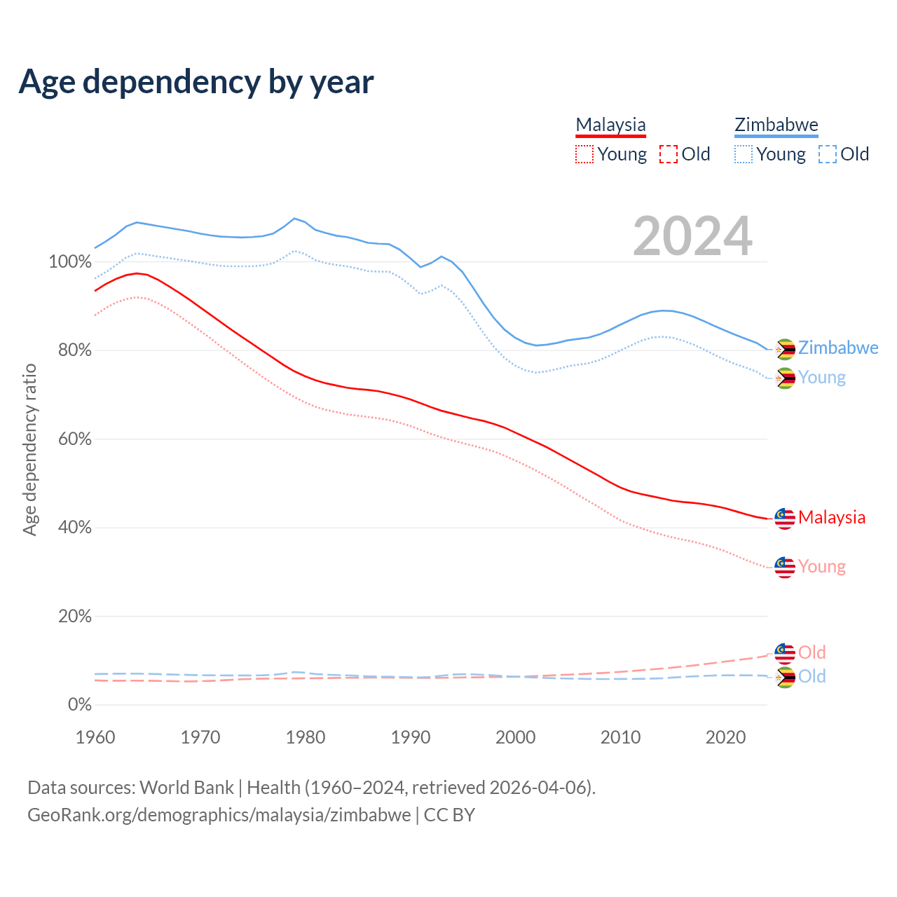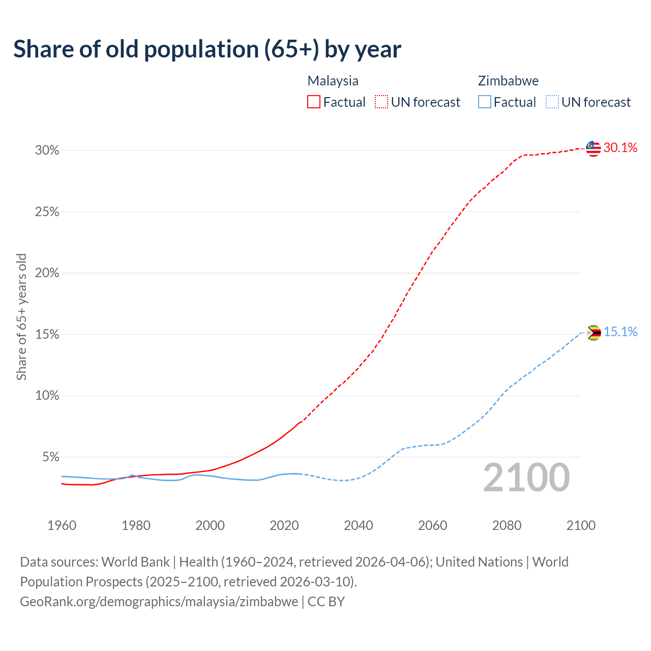 The share of older people aged 65 and over is 7.74% in Malaysia and 3.6% in Zimbabwe. Life expectancy in Malaysia compared to Zimbabwe .