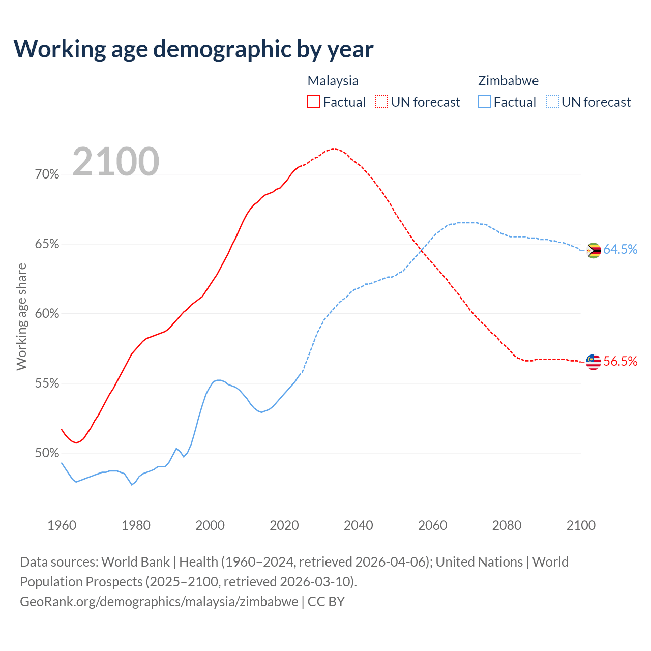 Median age Malaysia vs Zimbabwe, 1960-2100