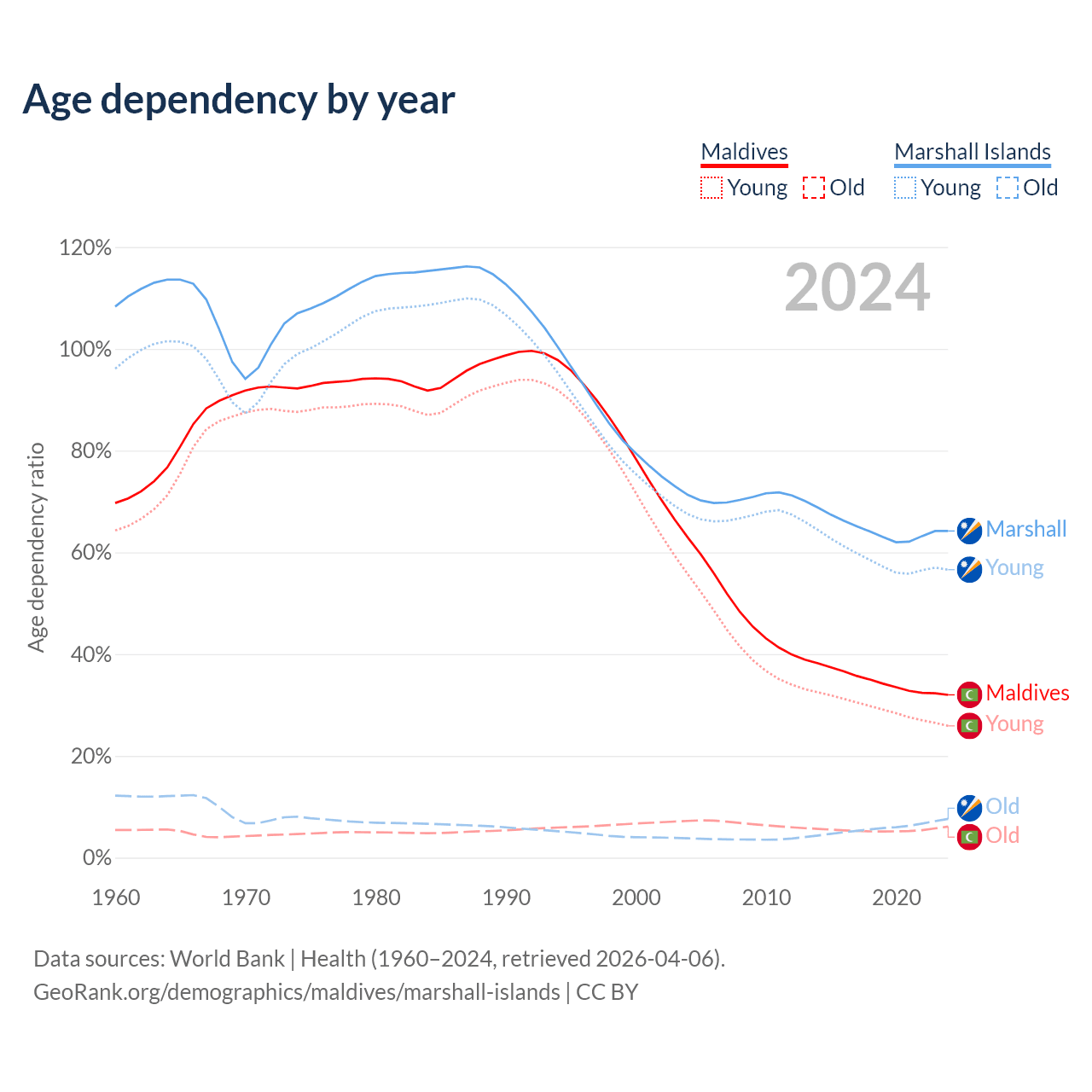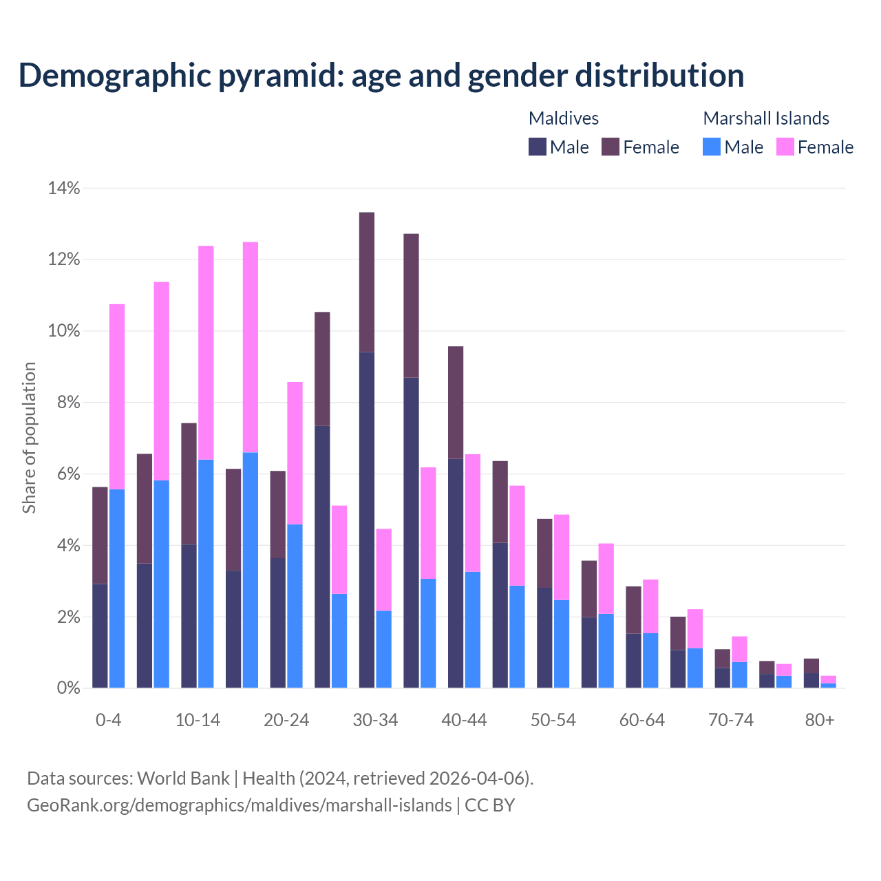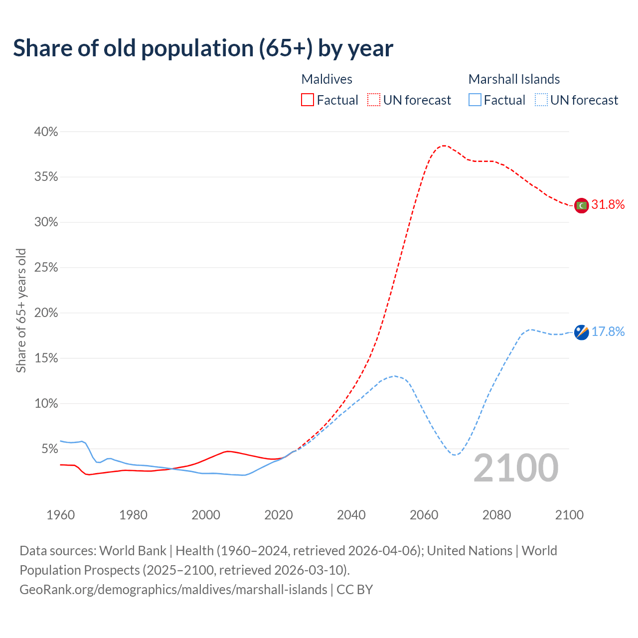 - The share of old-age demographic (65+) in Maldives is 4.64% vs 4.64% in the Marshall Islands.