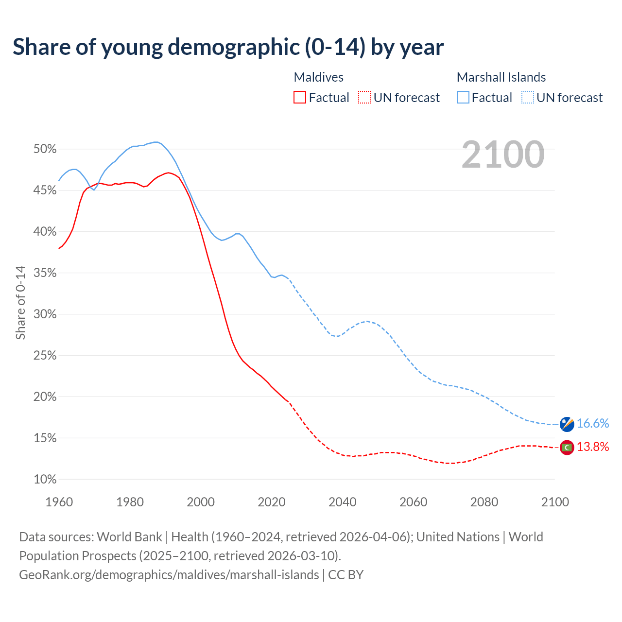 - The share of young demographic (0-15 years old) in Maldives is 19.6% vs 34.5% in the Marshall Islands.
