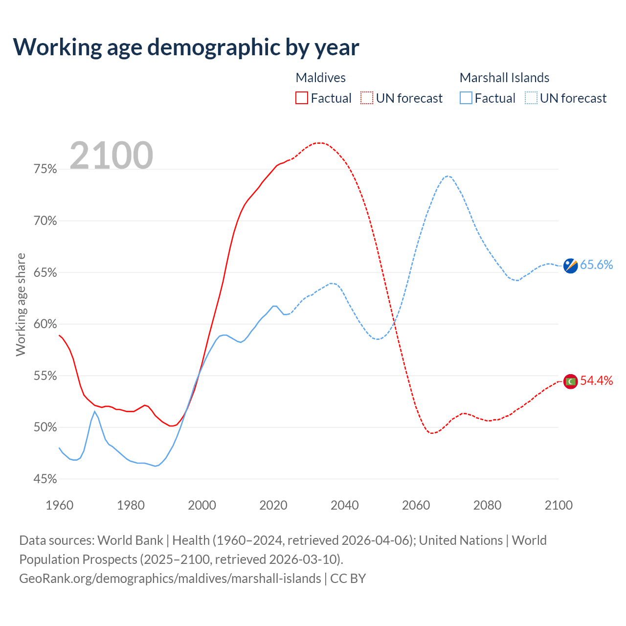 Median age Maldives vs Marshall Islands, 1960-2100