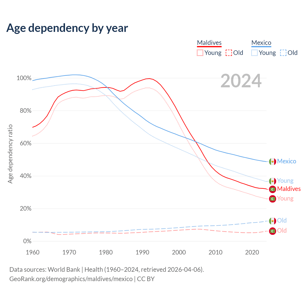 Data sources: World Bank | Health (1960–2024, retrieved 2026-04-06); U.S. Census Bureau (1960–2024, retrieved 2026-02-08).