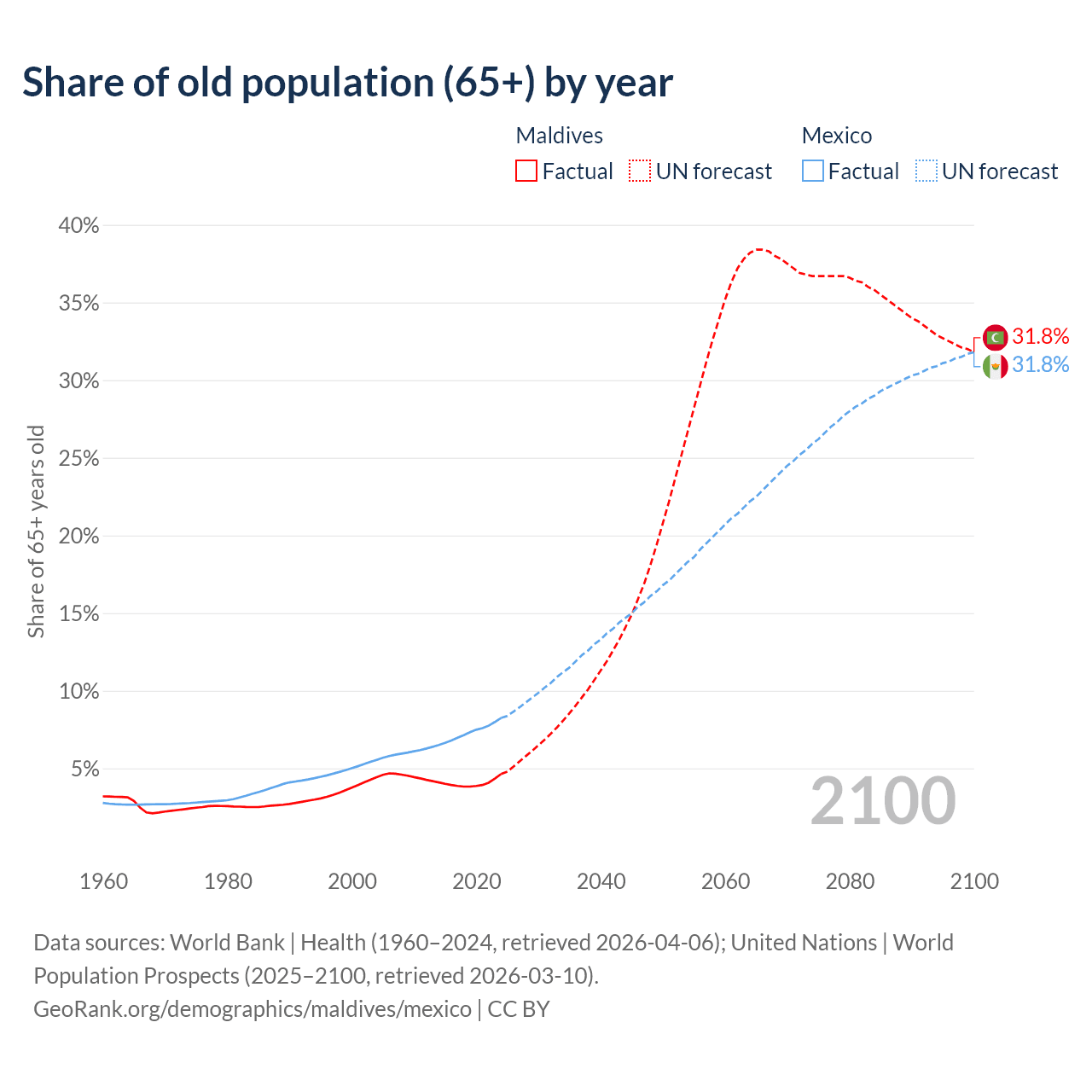 The share of older people aged 65 and over is 4.64% in Maldives and 8.25% in Mexico. Life expectancy in Maldives compared to Mexico .