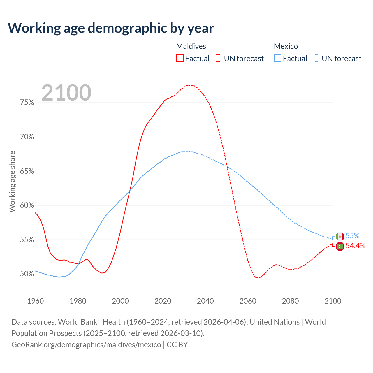 - Maldives has 403K working age adults (aged 15-64) vs 89.6M in Mexico.