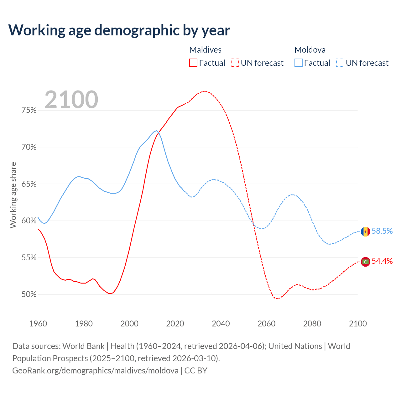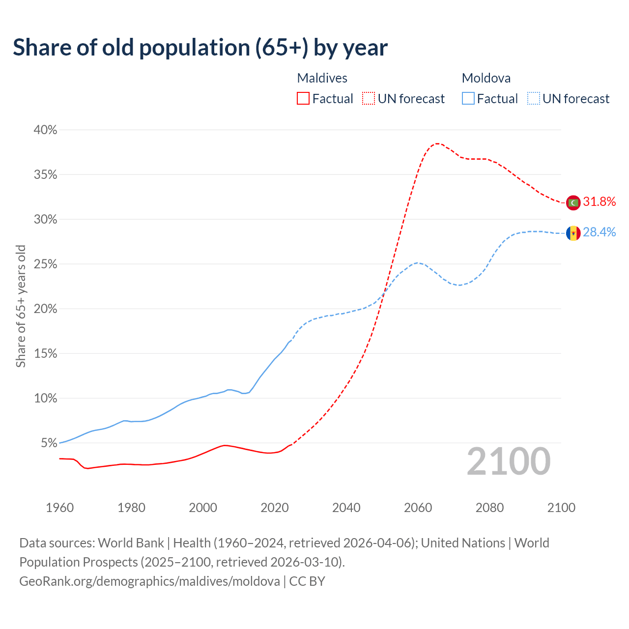 Median age Maldives vs Moldova, 1960-2100