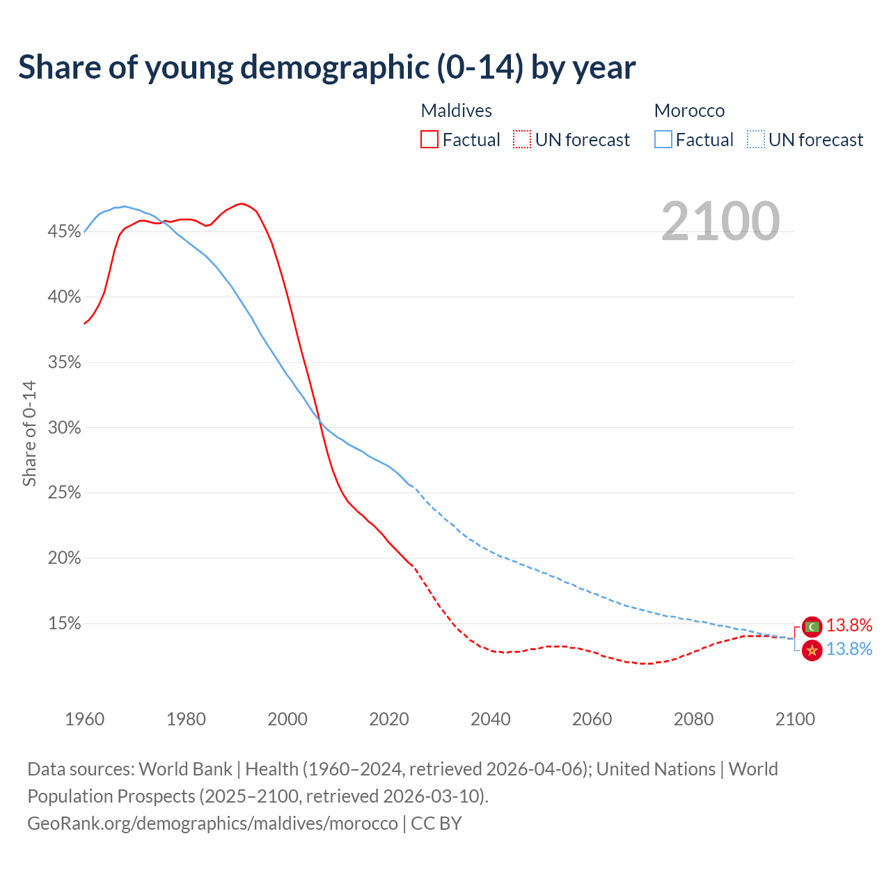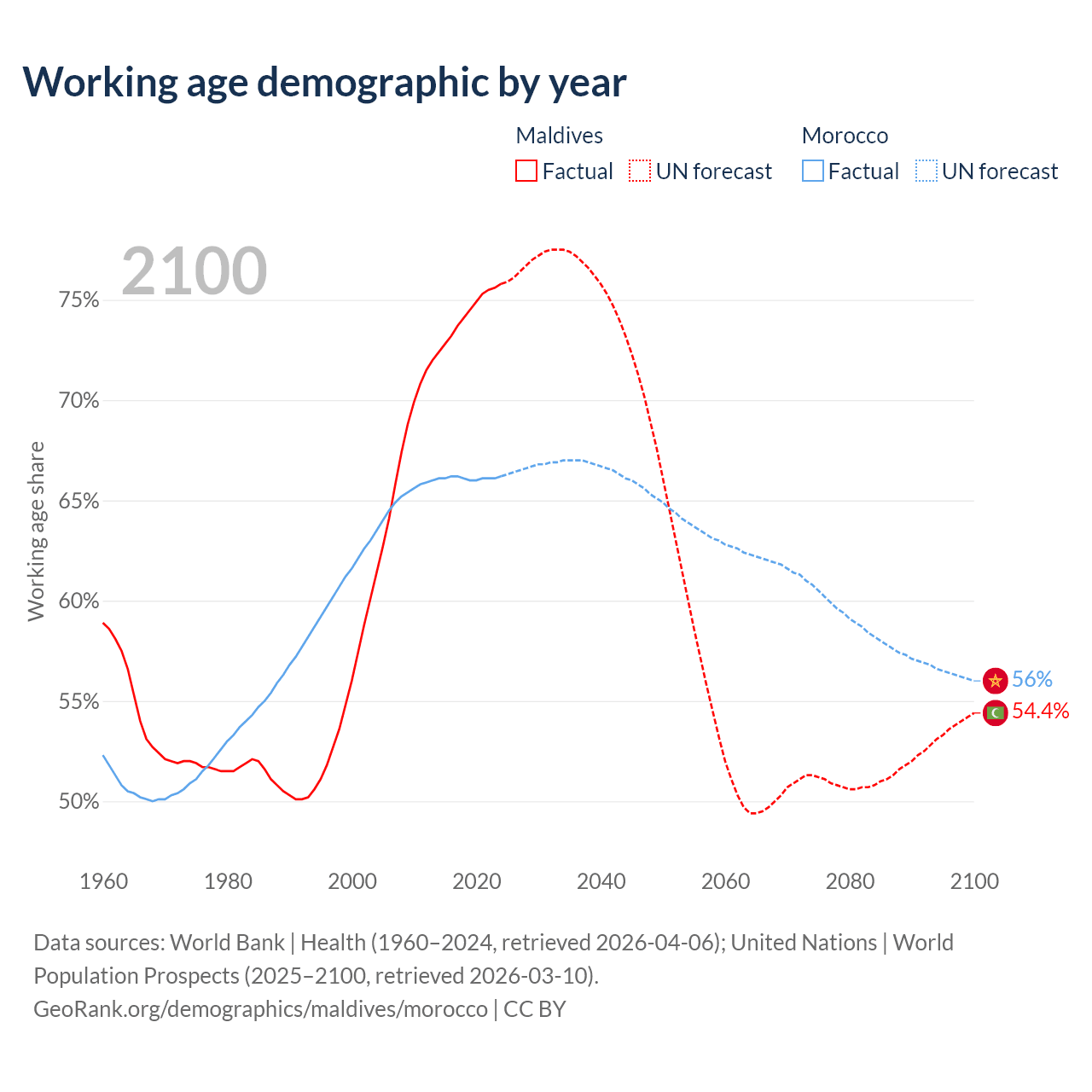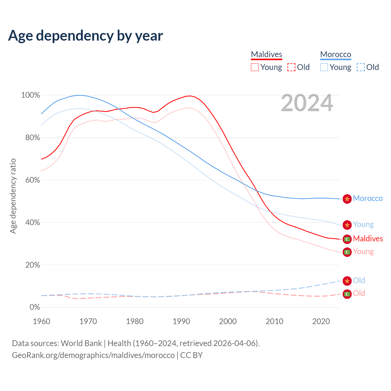 - Maldives is ranked 90/196 by median age (oldest to youngest) vs 100/196 for Morocco.