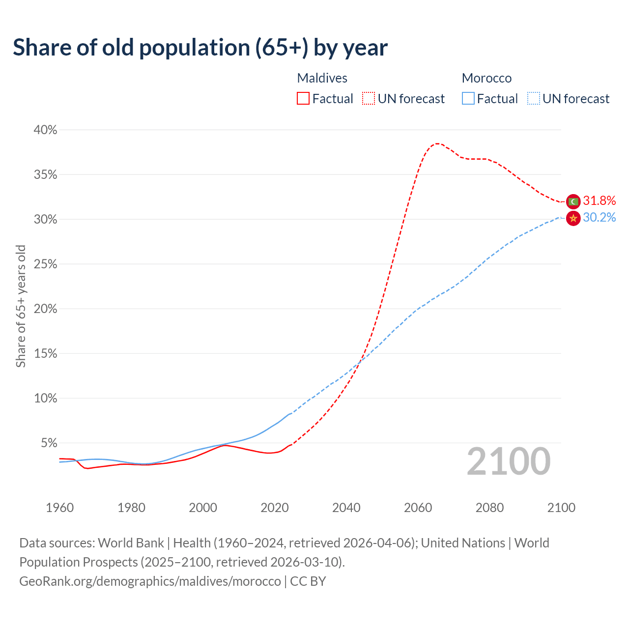 - The share of old-age demographic (65+) in Maldives is 4.64% vs 8.14% in Morocco.
