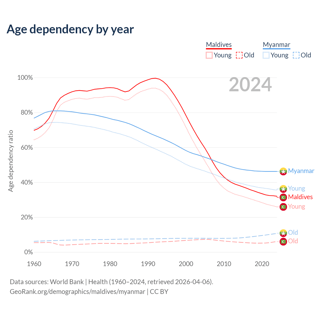 Data sources: World Bank | Health (1960–2024, retrieved 2026-04-06); U.S. Census Bureau (1960–2024, retrieved 2026-02-08).