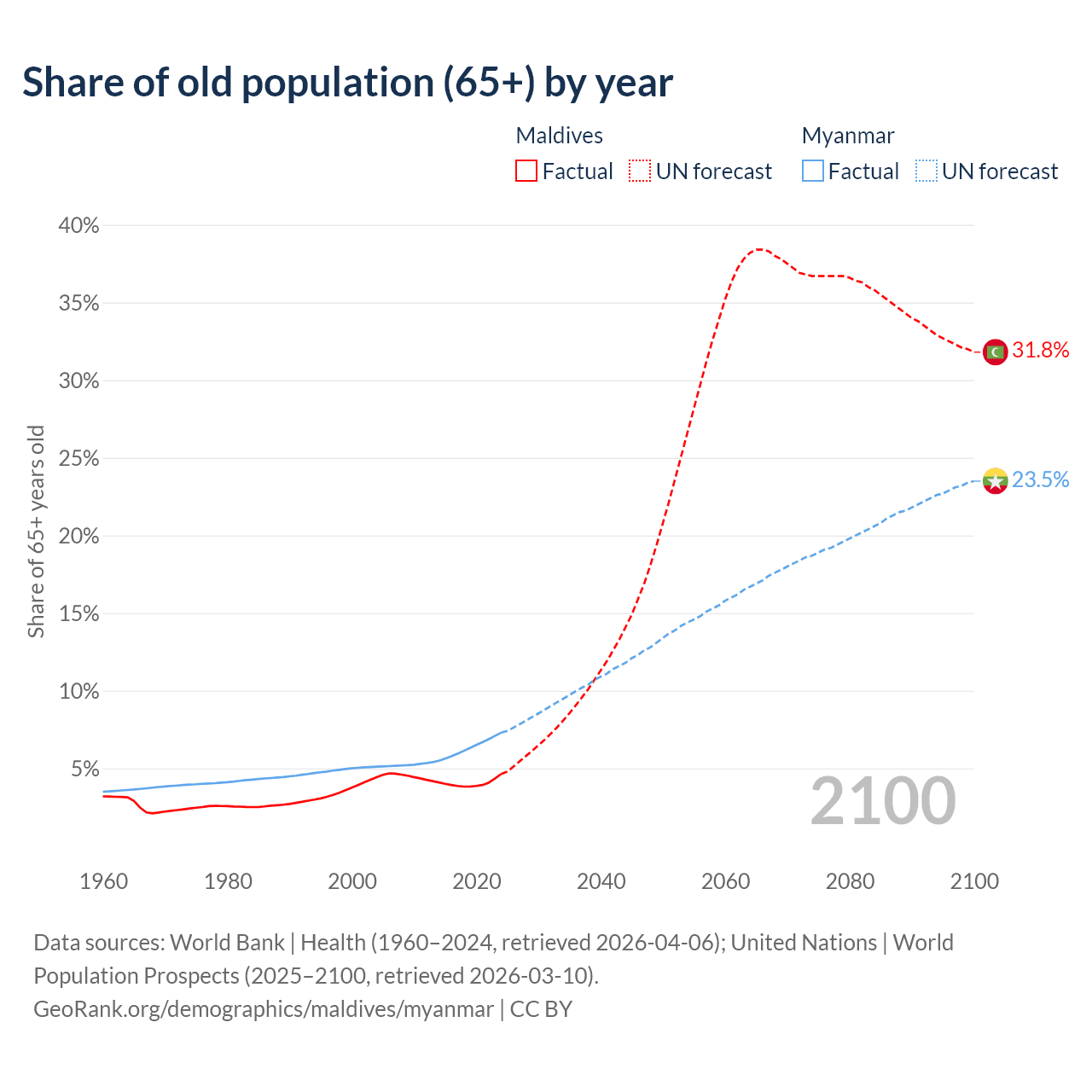 The share of older people aged 65 and over is 4.64% in Maldives and 7.3% in Myanmar. Life expectancy in Maldives compared to Myanmar .