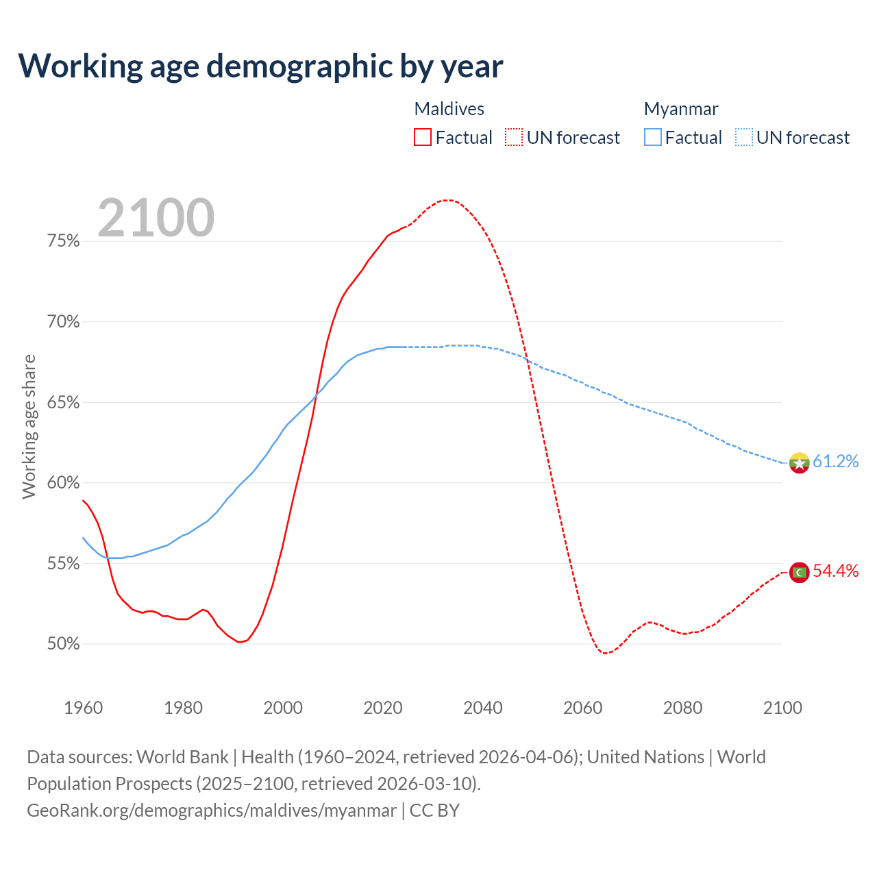 Median age Maldives vs Myanmar, 1960-2100