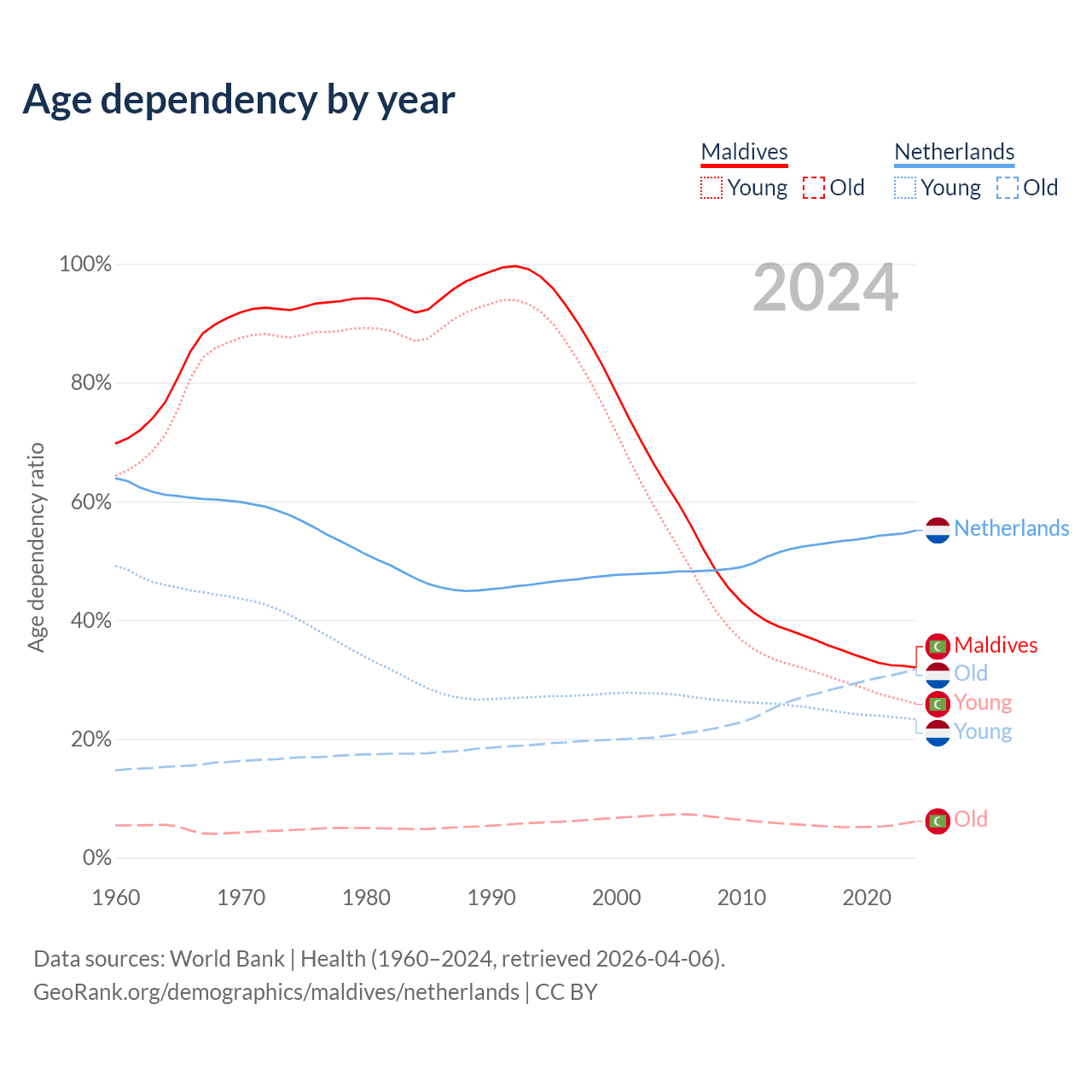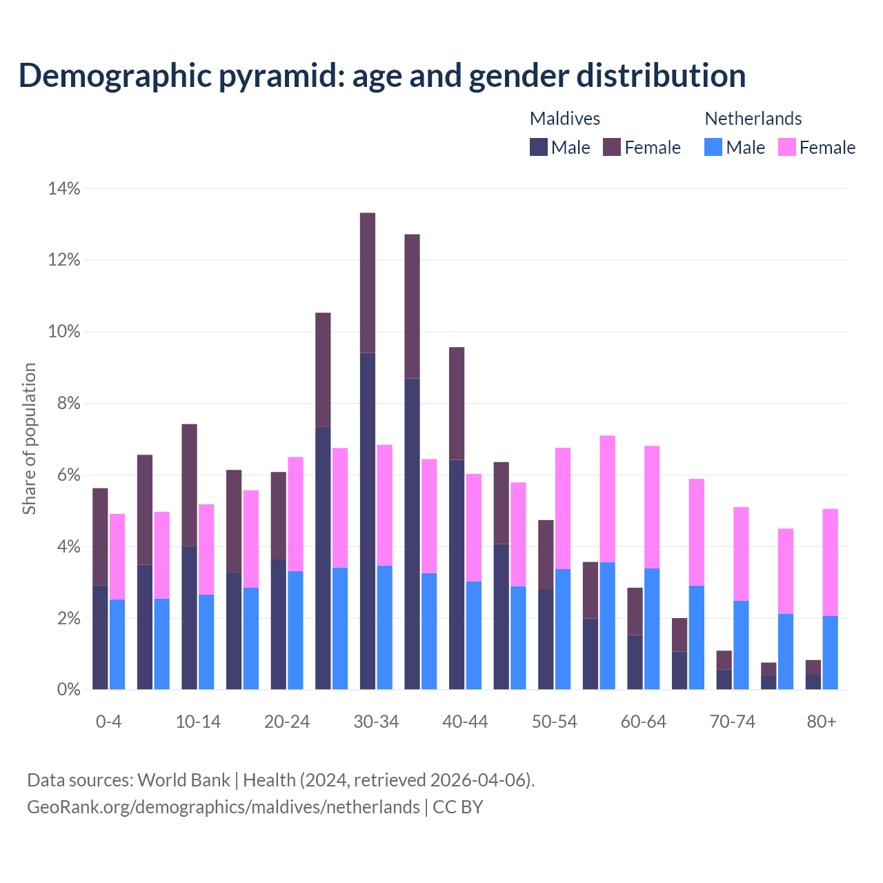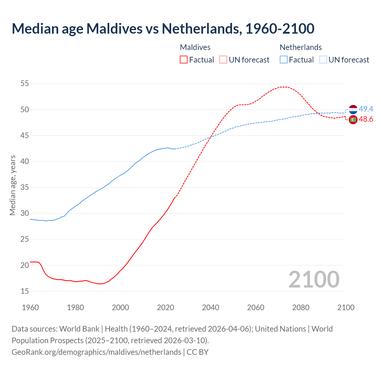 - Maldives is ranked 90/196 by median age (oldest to youngest) vs 33/196 for the Netherlands.