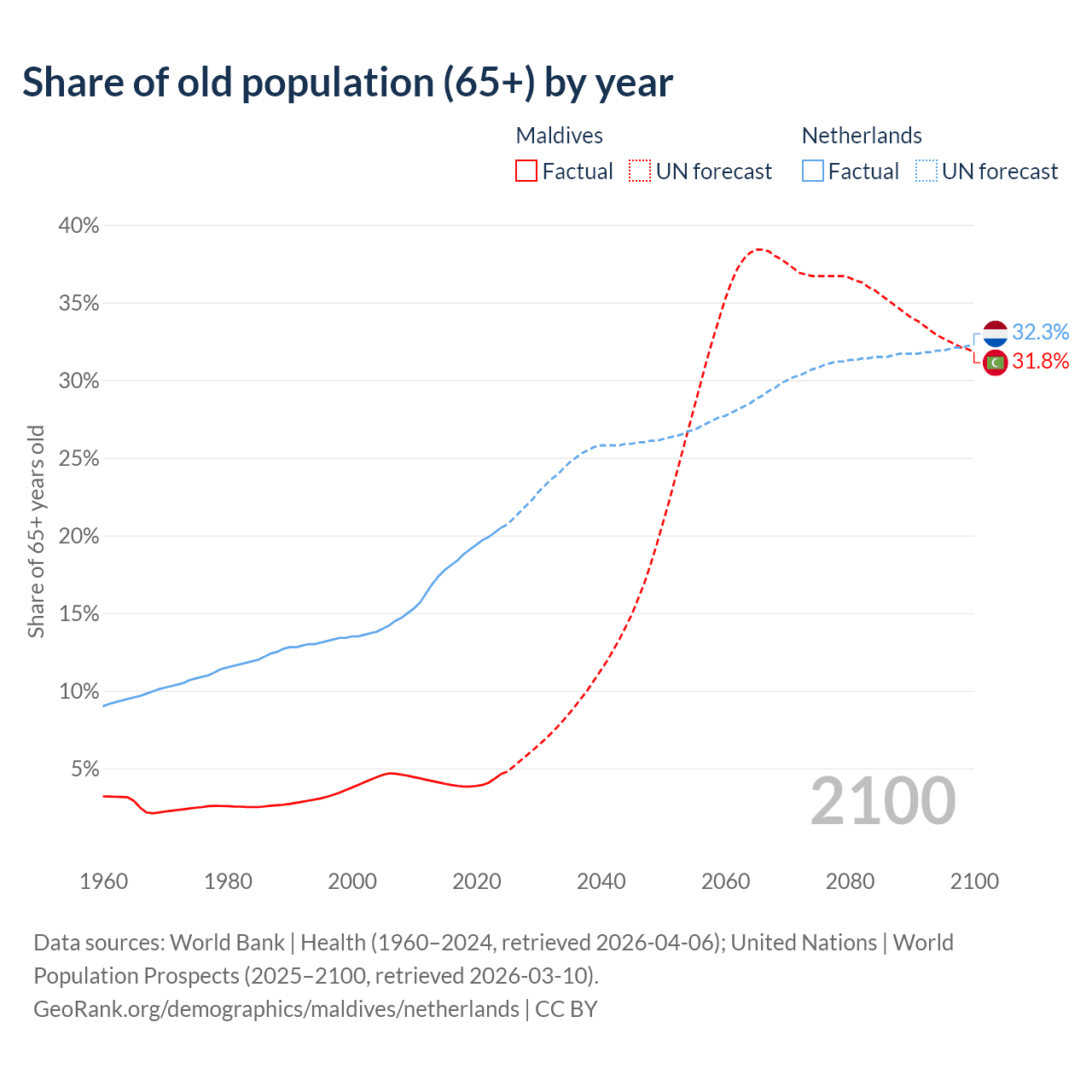 - The share of old-age demographic (65+) in Maldives is 4.64% vs 20.5% in the Netherlands.