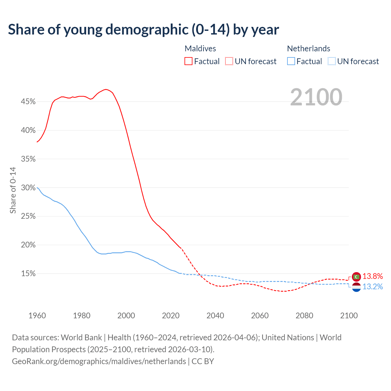 - The share of young demographic (0-15 years old) in Maldives is 19.6% vs 15% in the Netherlands.