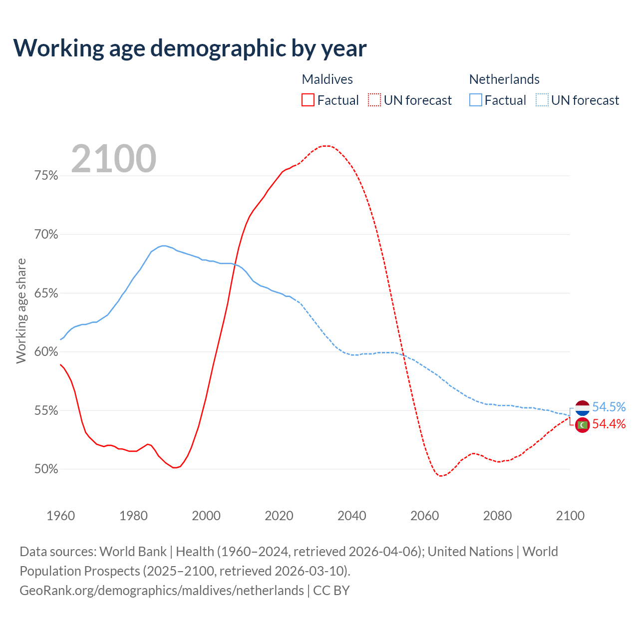 - Maldives has 403K working age adults (aged 15-64) vs 11.8M in the Netherlands.