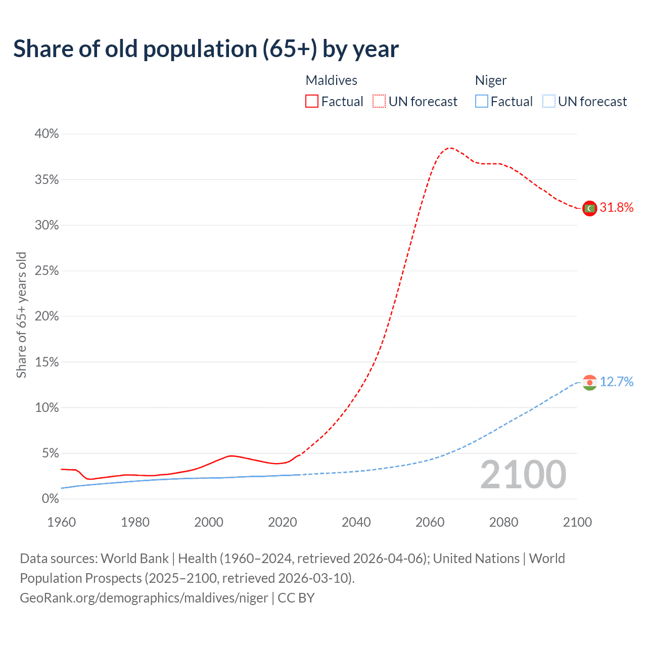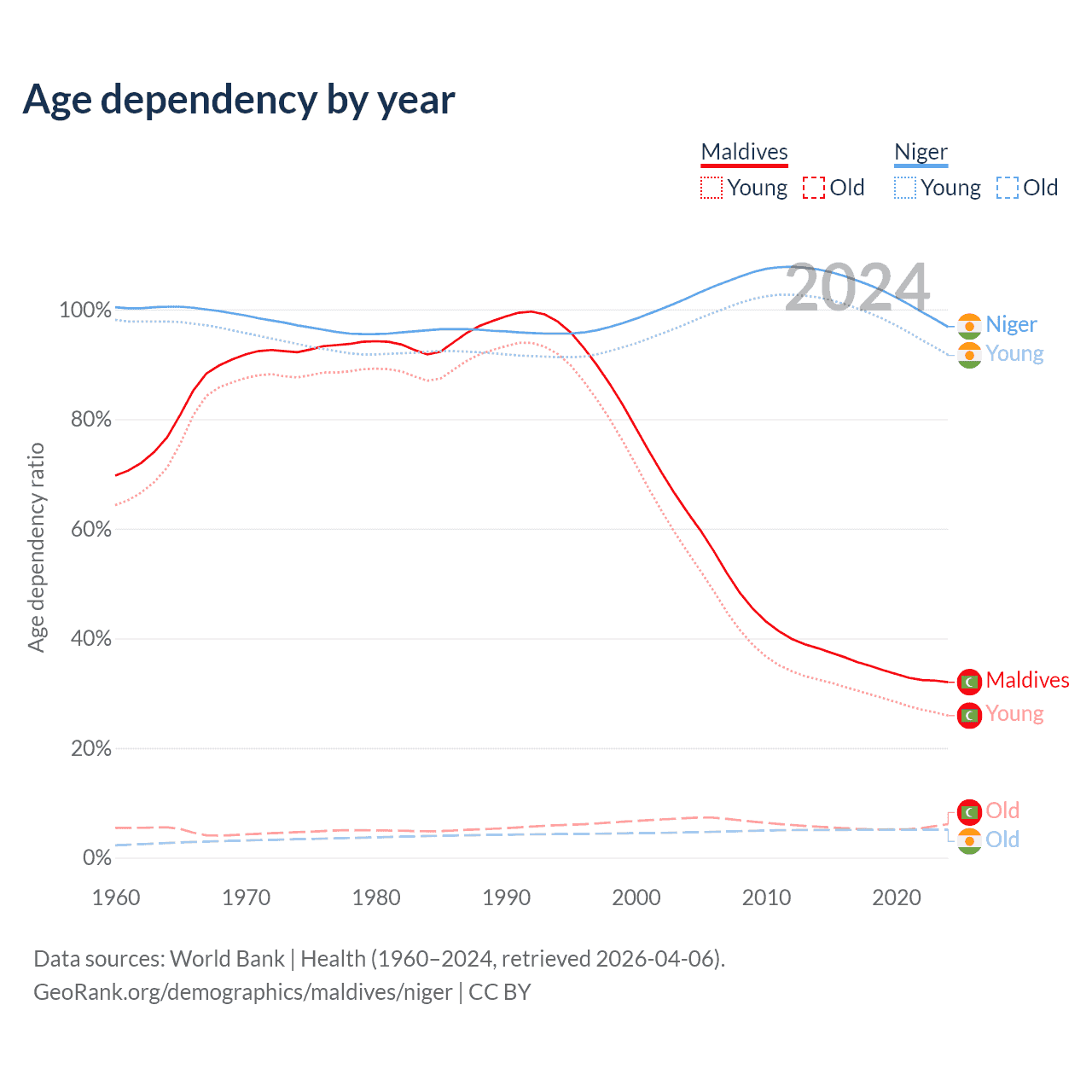- The share of old-age demographic (65+) in Maldives is 4.64% vs 2.59% in Niger.