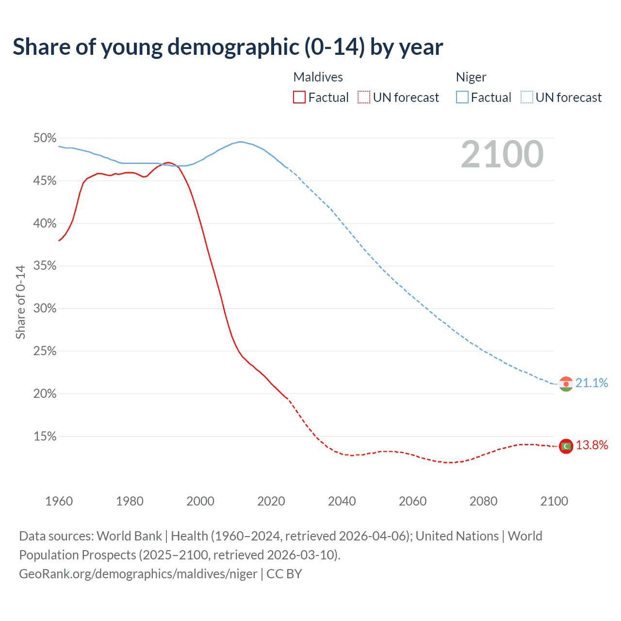 - The share of young demographic (0-15 years old) in Maldives is 19.6% vs 46.6% in Niger.
