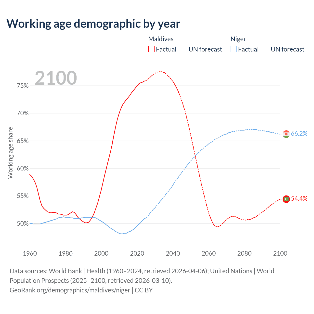 Median age Maldives vs Niger, 1960-2100