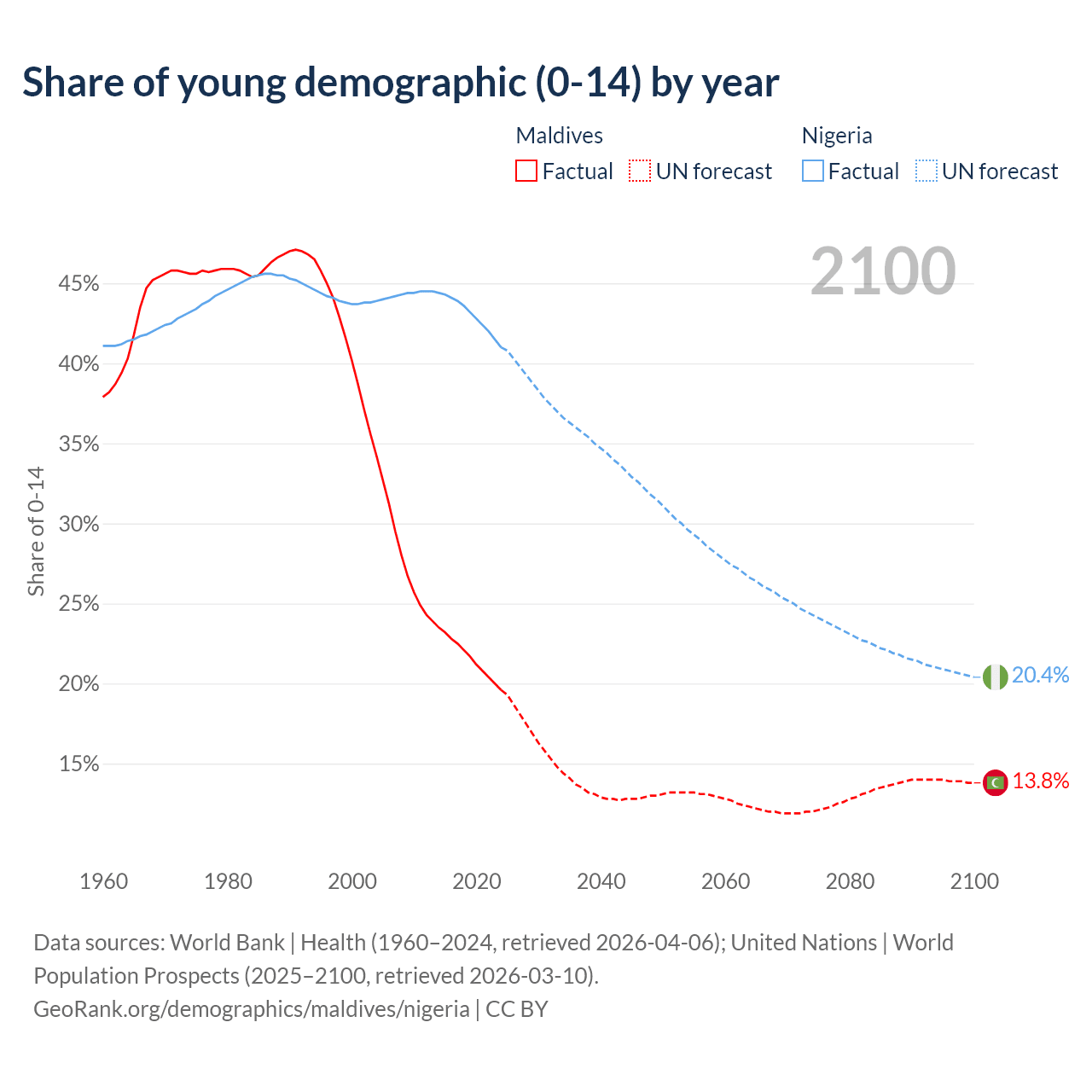 - The share of young demographic (0-15 years old) in Maldives is 19.6% vs 41% in Nigeria.